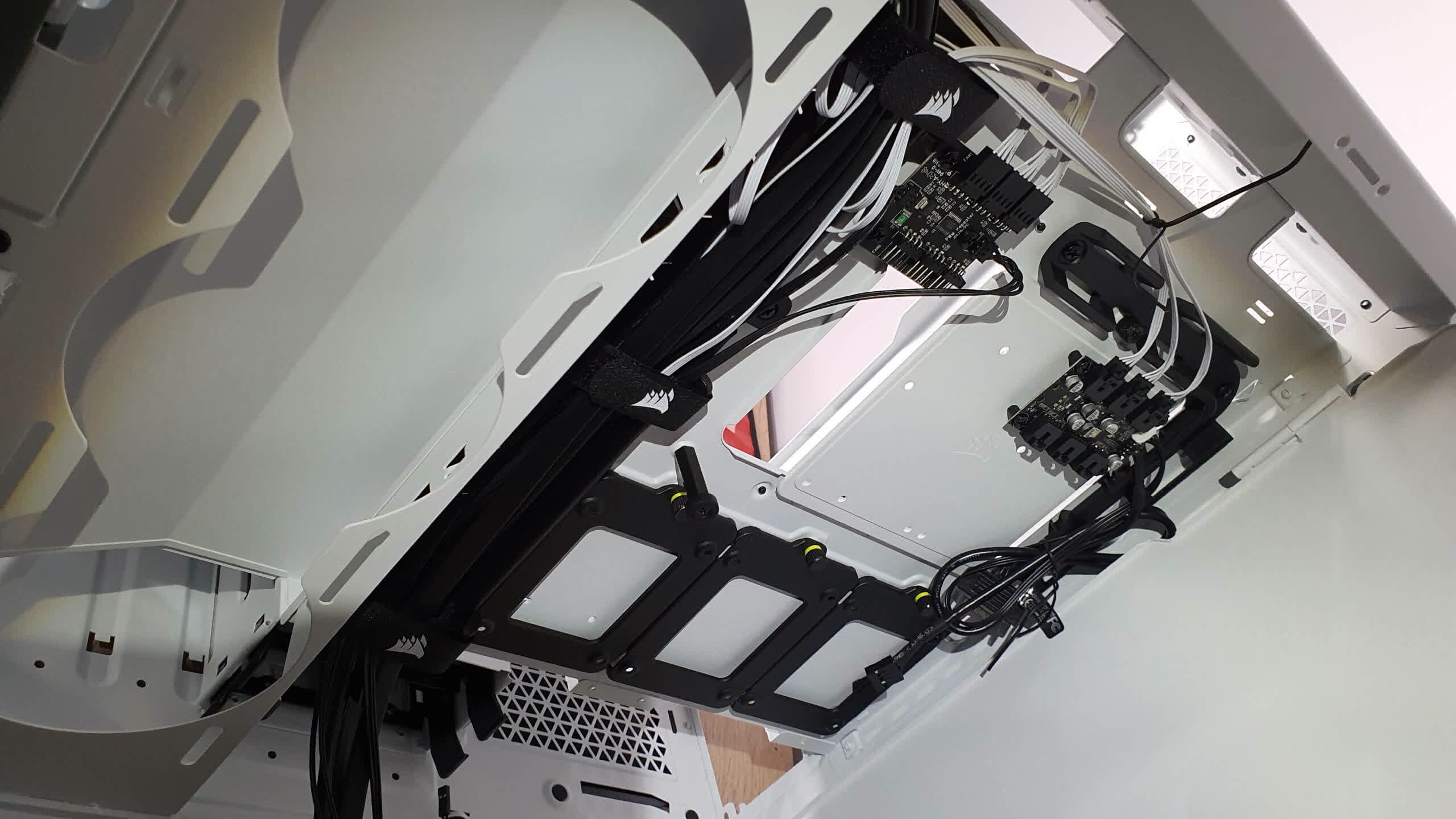 I recall from experience that it's better to attach all the cables and wires to the mobo before screwing the radiator to the case's roof, lest it gets in the way and makes life difficult. The case has a built-in fan hub and four fans, all with separate RGB connections. Combined with the AIO cooler's command core unit, the two radiator fans, and the front panel I/O cables, there are a lot of wires to contend with, and that's before adding the PSU.