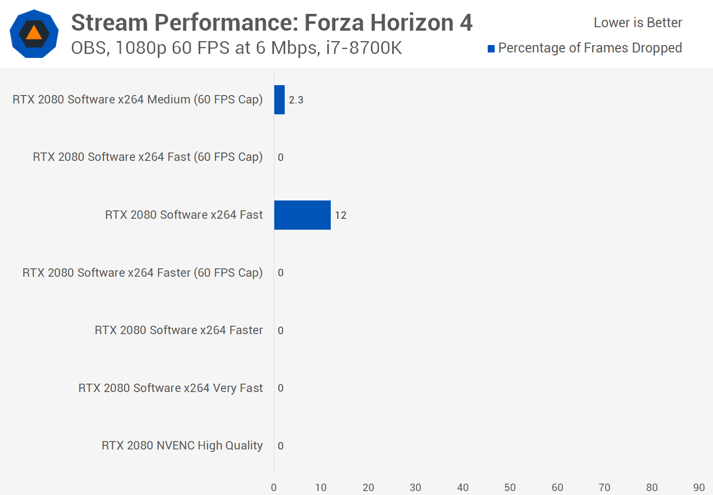 The good news, though, is while you'll be running the game at a lower framerate while NVENC is working, the stream itself will have perfect performance with no dropped frames, even if the game is using 100% of the GPU. AMD's encoding engine doesn't impact the game's framerate nearly as much, but it drops about 90% of the frames when the GPU is being heavily used, making it useless as we already discussed earlier.