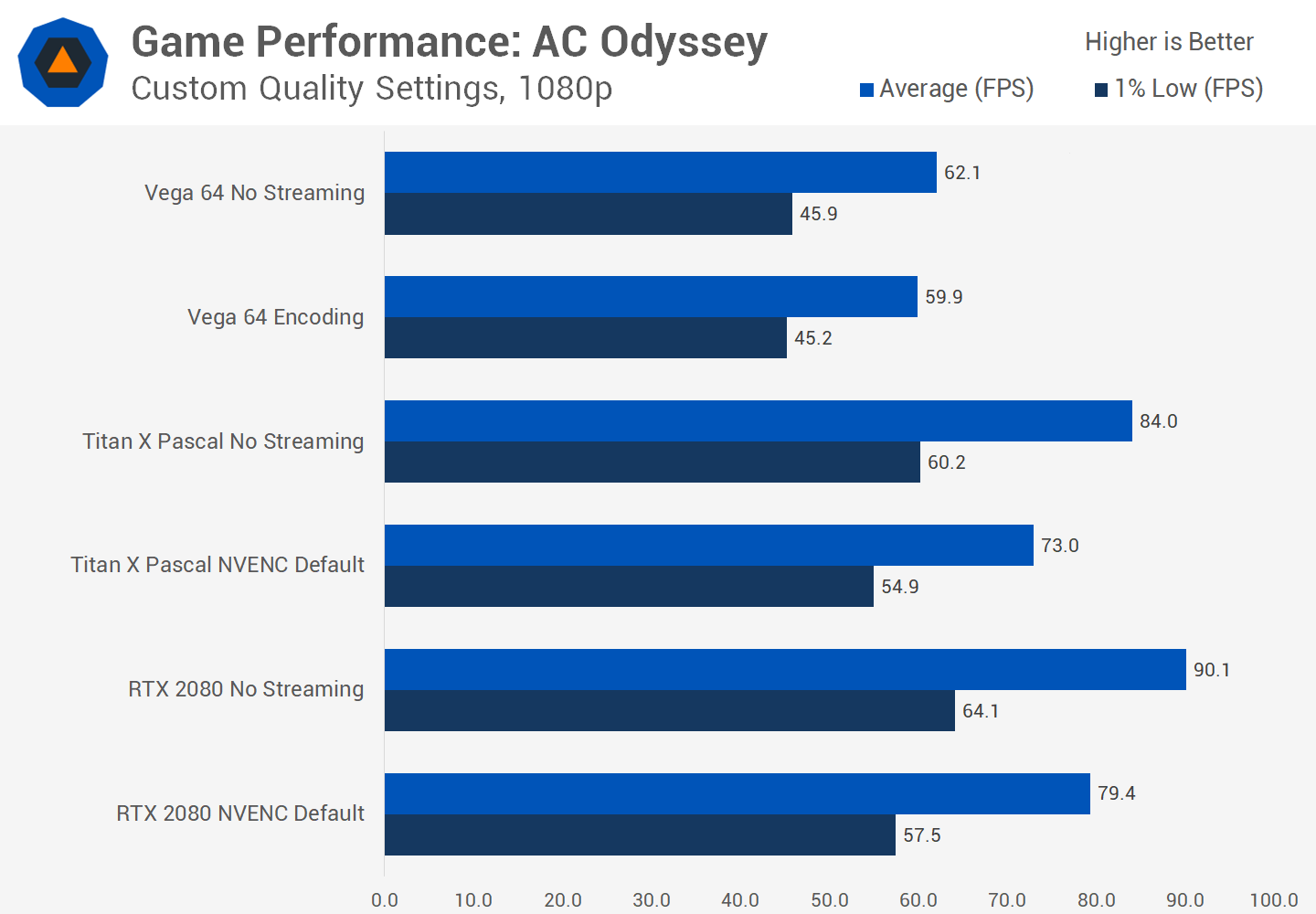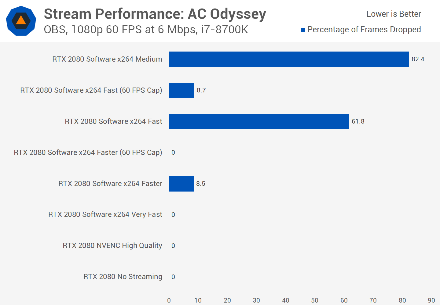 With the Core i7-8700K and the RTX 2080 playing Odyssey using our custom quality preset, we were only able to encode the game using the x264 veryfast preset without suffering from frame drops in the stream output. X264 veryfast encoding also reduced the frame rate by 17%, which was a larger reduction than simply using NVENC. Veryfast encoding is better visually than NVENC for this type of game, so the performance hit is worth it.