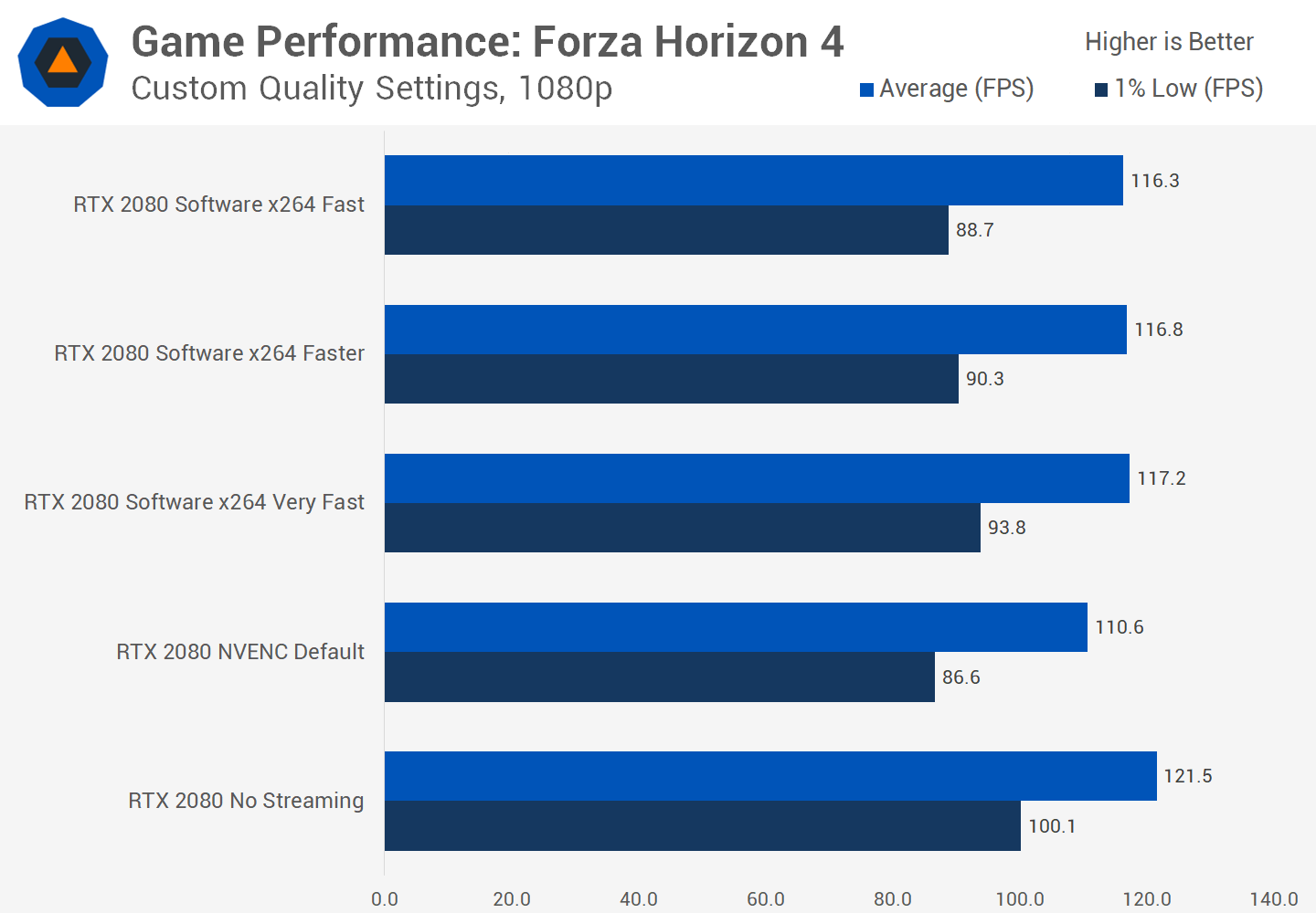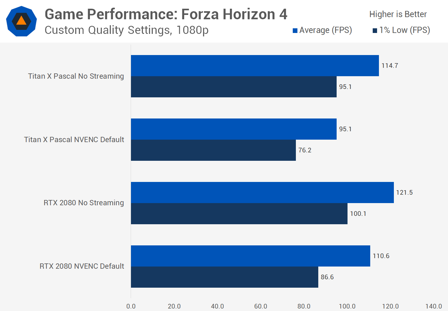 Enabling either Pascal or Turing's NVENC engine affects the frame rate of the game by around 10 to 20% depending on the game, in other words, you'll see a 10 to 20% drop to frame rate when capturing footage using NVENC, compared to not capturing the game at all. The more GPU limited the game is, the more of an impact NVENC will have, which is why Forza Horizon 4 is impacted more heavily than the heavy CPU user in Assassin's Creed Odyssey.