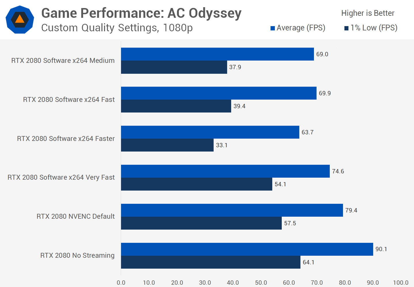 Software encoding performance depends on the type of game you're playing. In the case of Assassin's Creed Odyssey which heavily utilizes both the CPU and GPU, streaming using the CPU will have a noticeable affect on frame rate, and high quality encoding presets will struggle to keep up.
