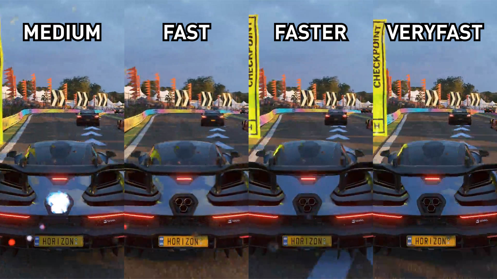 For faster motion in Forza Horizon 4, again I'd completely dismiss the veryfast preset immediately because it's worse than NVENC for this type of content. Unfortunately the tight bitrate limit of 6000 kbps prevents any preset from doing true justice to the source material, but once again medium gets the closest and provides an improvement over fast.
