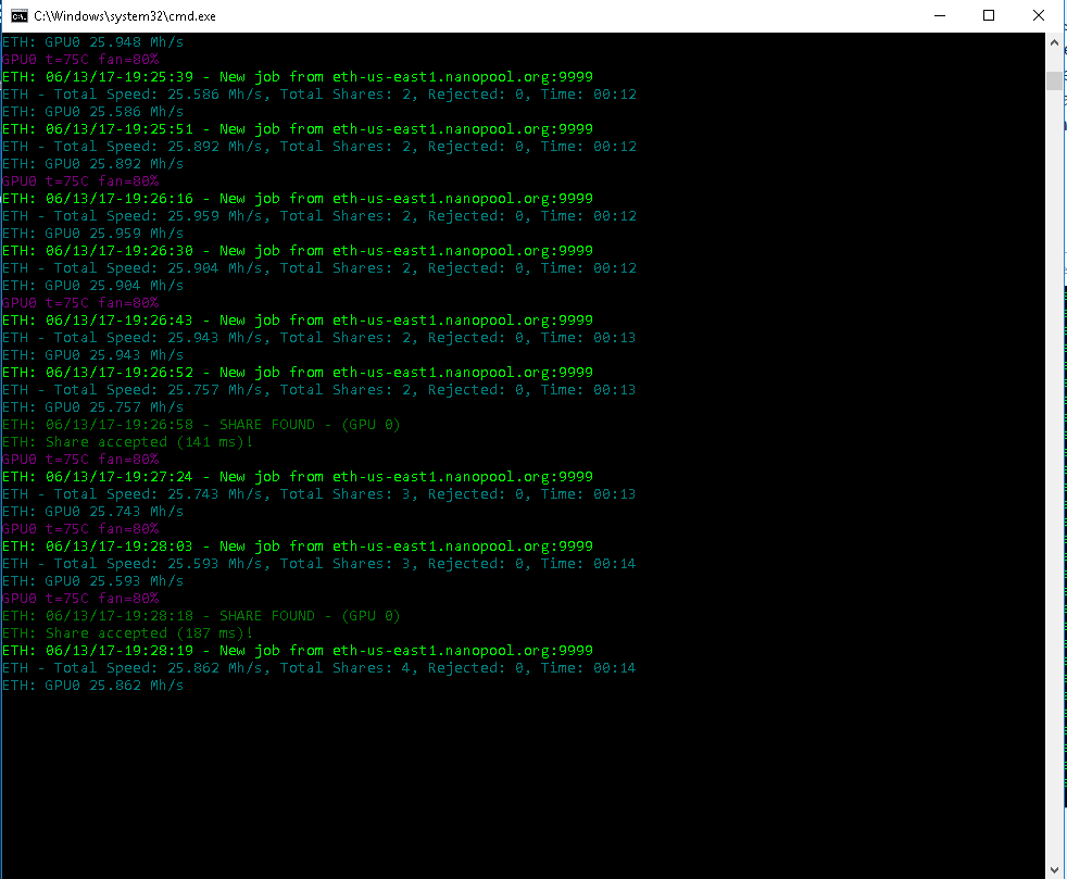 And that's about it. With some basic skills, it should only take a few minutes to set up a GPU miner. I would hesitate to go out and spend thousands of dollars on graphics cards, but if you want to make some extra cash, mining is an easy way to do it. Depending on how the price and difficulty fluctuate in the future, GPU mining of Ethereum could stay profitable for another week or another year. There's no way to tell. Unless you have dozens of cards sitting around, this isn't a get rich quick scheme. I see mining as a fun hobby that can also make a bit of money on the side.