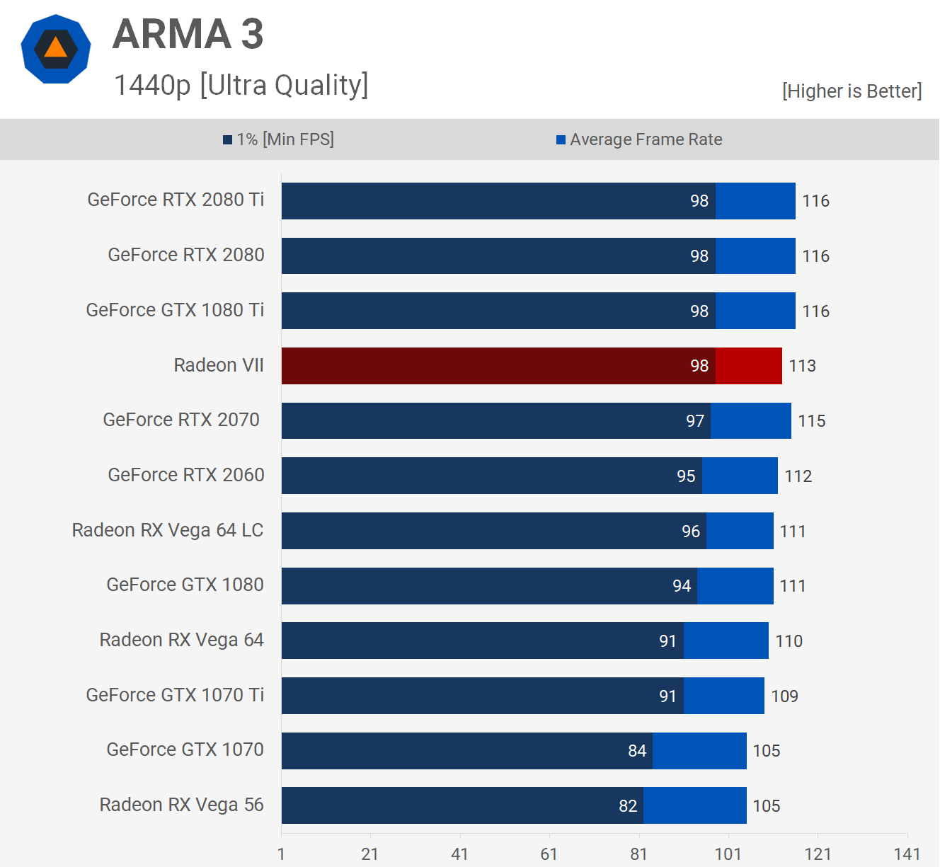 Far Cry 5 is a well optimized title and it also happens to be sponsored by AMD. I would say this is a fairly even playing field and as such the Radeon VII and GeForce RTX 2080 are basically neck and neck.