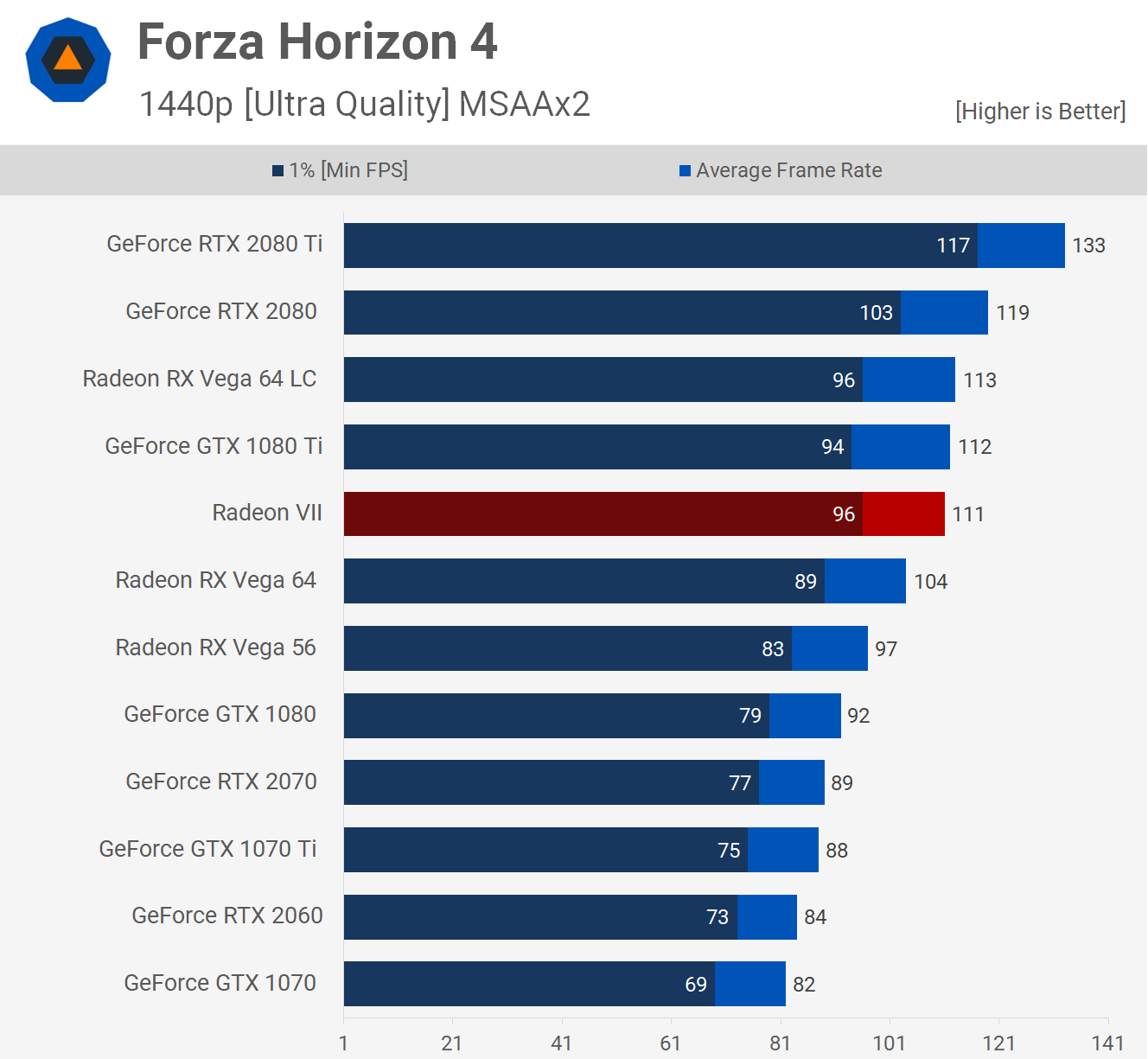 Forza Horizon 4 is another well optimized title and while Vega gives the Pascal based GeForce 10 series GPUs a pounding, the new RTX models don't suffer from the same weakness and the RTX 2080 was just able to outpace the new Radeon VII.