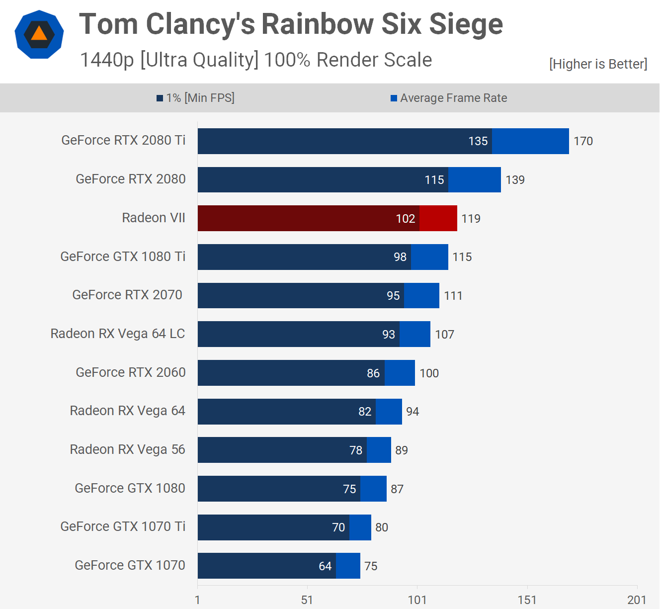 Nvidia Turing architecture is well suited to Rainbow Six Siege and where the Radeon GPUs once enjoyed a strong performance advantage in this title, that's no more. Here the Radeon VII struggled to keep pace with the RTX 2080 and in fact was just a whisker ahead of the RTX 2070.