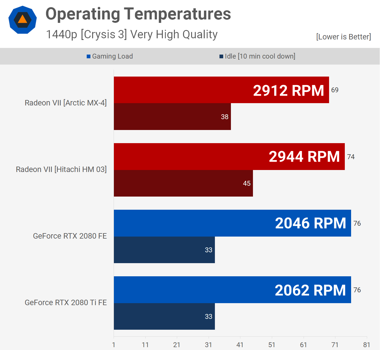 Out of the box with an ambient room temp of 21 degrees the Radeon VII hit 74 degrees. However when we went back and re-tested using the thermal paste that temperature under the same conditions dropped to just 69 degrees and the fan speed went unchanged.