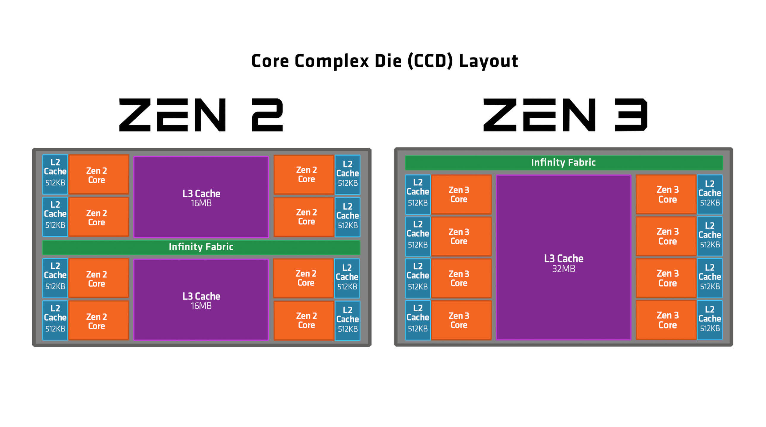 The chiplet design was retained and refined for the next revision, Zen 3, released at the end of 2020. One major target for improvement was the CCX structure within each CCD. In Zen 2, the latter comprised two CCXs, each with 4 cores and 16MB of L3 cache.