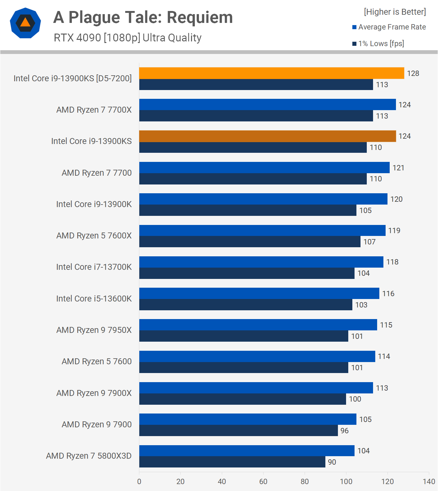 Before we take a look at the gaming average performance, here's a new addition to our CPU testing with A Plague Tale: Requiem. Here the 13900K was good for 120 fps on average which made it just 3% slower than the 7700X. However, the 13900KS was able to match the 7700X and then armed with DDR5-7200 memory we extracted a further 3% performance.