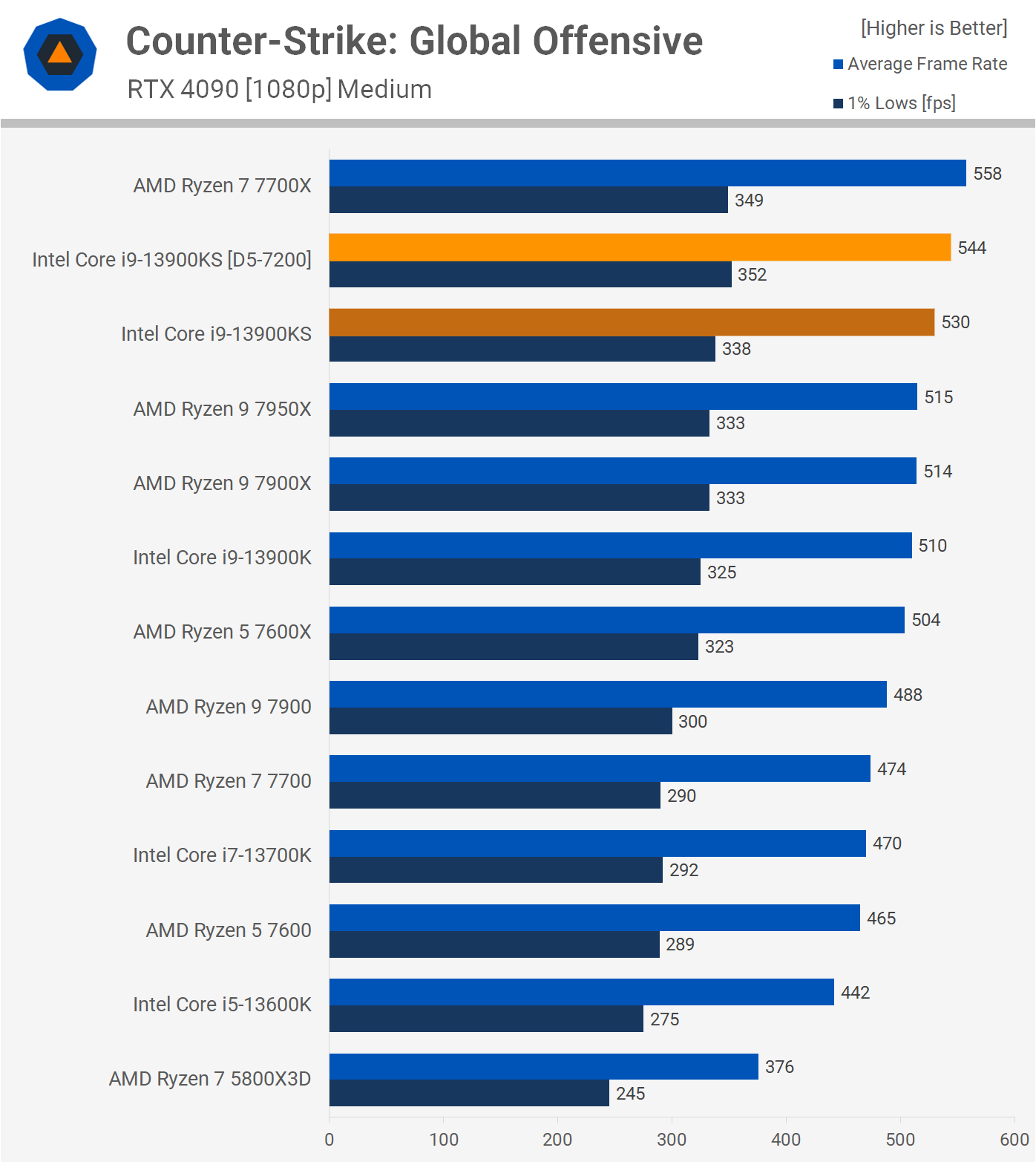 FPS mad CSGO players can enjoy a 20 fps boost at 1080p with the RTX 4090, that's a 4% delta, but for the 19300KS that's a big result and if you opt for DDR5-7200 memory you can push that up to 544 fps.