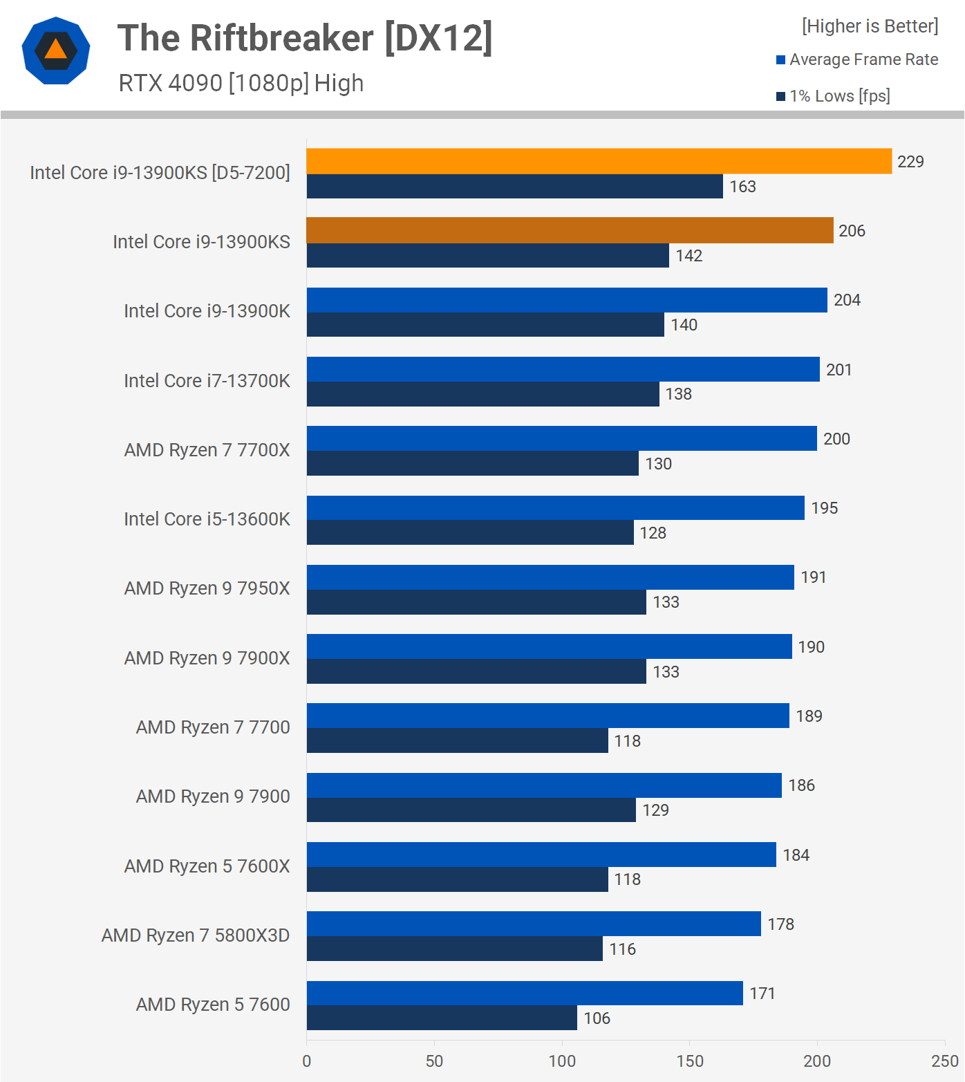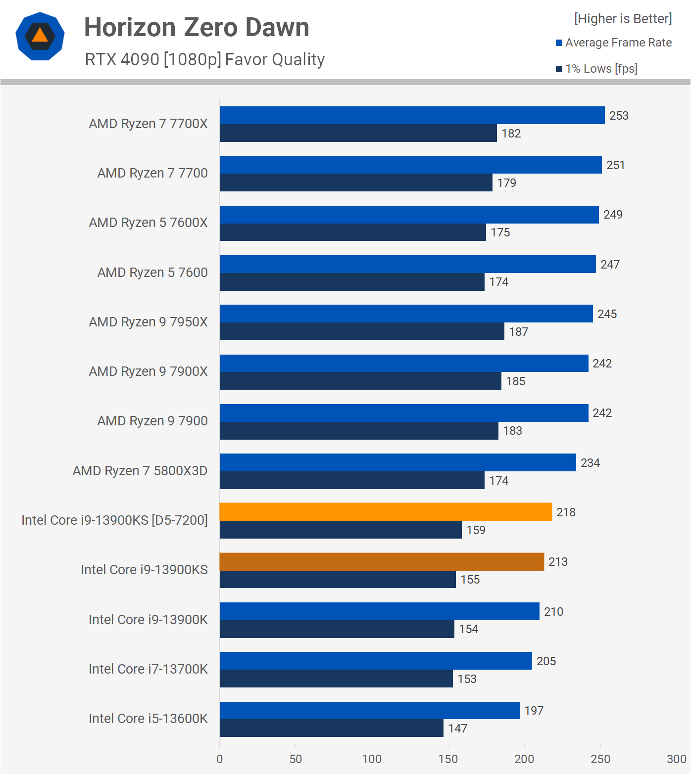 We're looking at a 1.5% performance boost in Horizon Zero Dawn for the 13900KS while using DDR5-7200 memory boosted performance by a further 2%, hitting 218 fps.