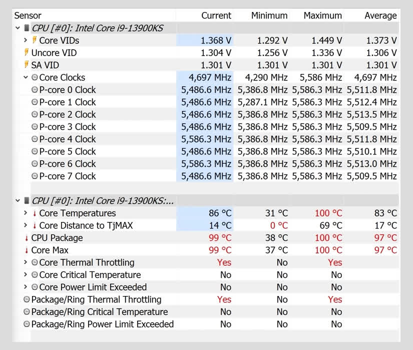 Now, the biggest issue with the 13900KS is surprise, surprise... power and thermals, the same issue with the 13900K and the 12900K before it. After a matter of seconds when running an all-core workload the 13900KS spikes to at least 100c, at which point core throttling is triggered, dropping package power from 300 watts down to 260 watts.