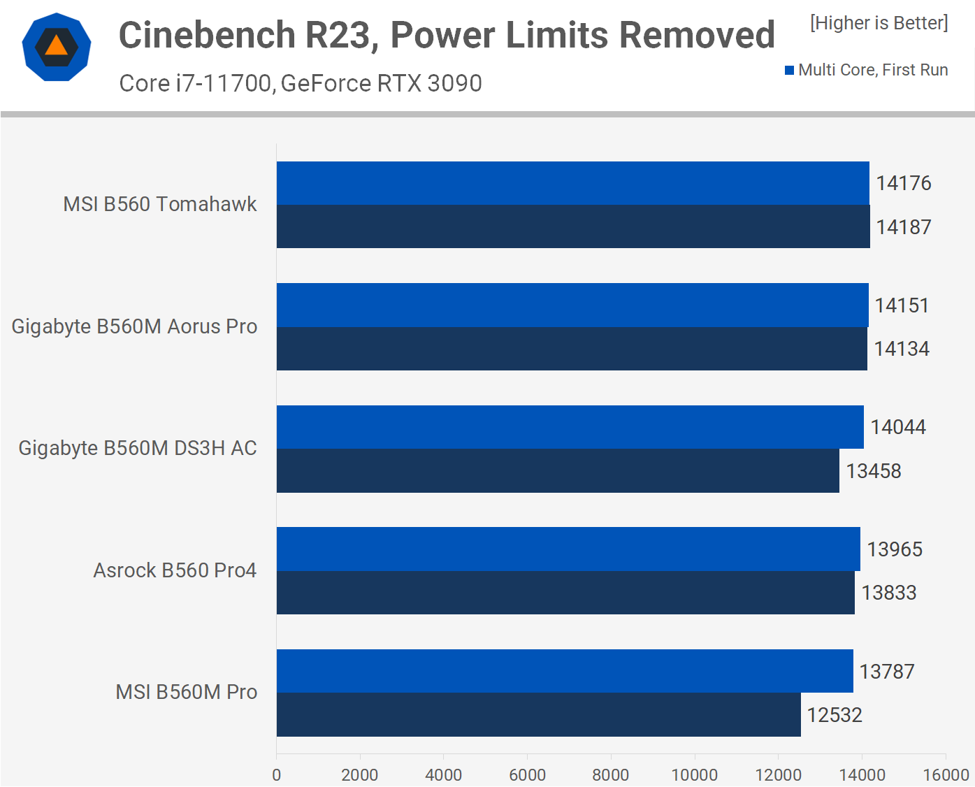 The Tomahawk and Aorus Pro run the 11th-gen processor without power limits, clocking the 11700 to 4.4 GHz, which allowed for a score of just over 14,000 pts.
