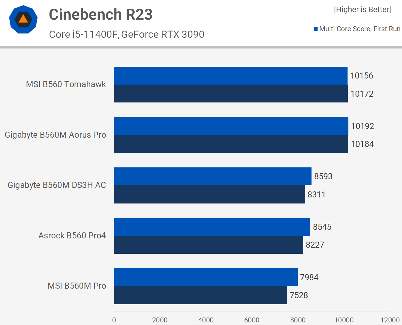 Here's a look at how these motherboards perform out of the box using the Core i5-11400F. The $200 Tomahawk and $180 Aorus Pro AX perform as expected, delivering a score of roughly 10,000 points in Cinebench R23.
