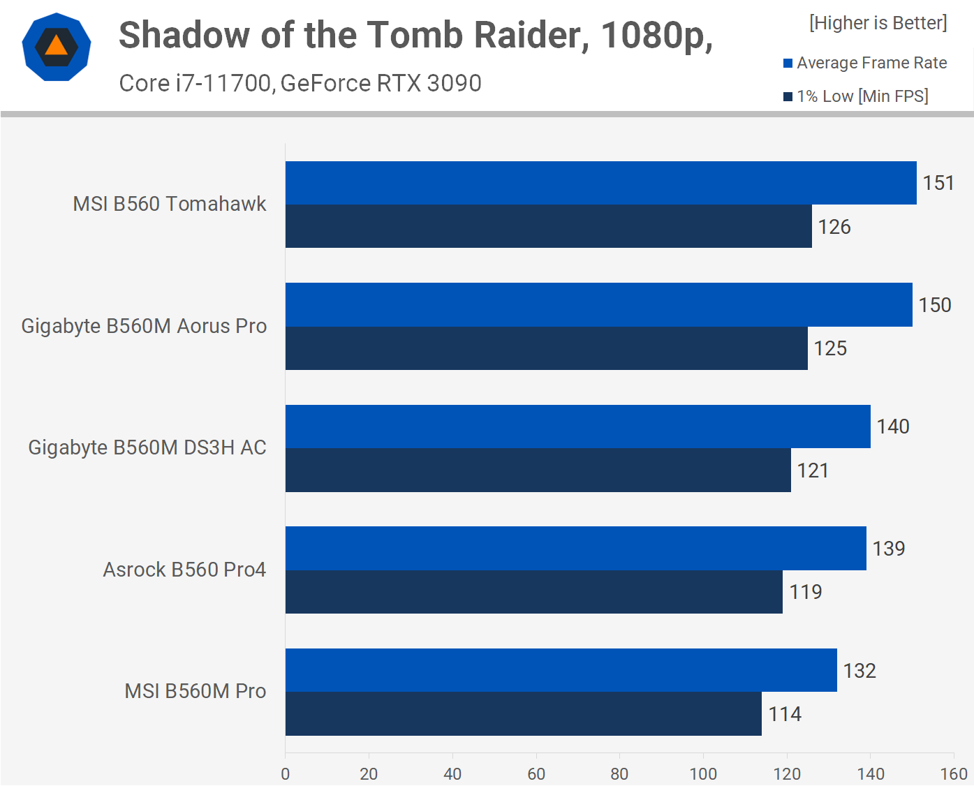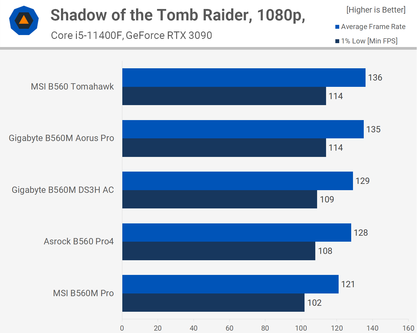 For those of you focused purely on gaming, the difference isn't as significant, at least in most games that don't max out the 11400F. Testing with Shadow of the Tomb Raider we see a 12% performance uplift from the B560M Pro to the Tomahawk. That's still a reasonable difference, but not close to the 35% margin we saw in Cinebench.