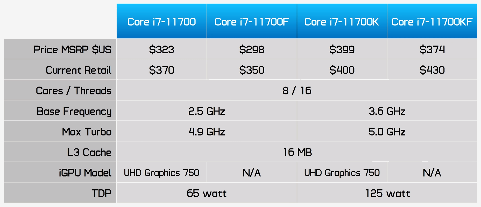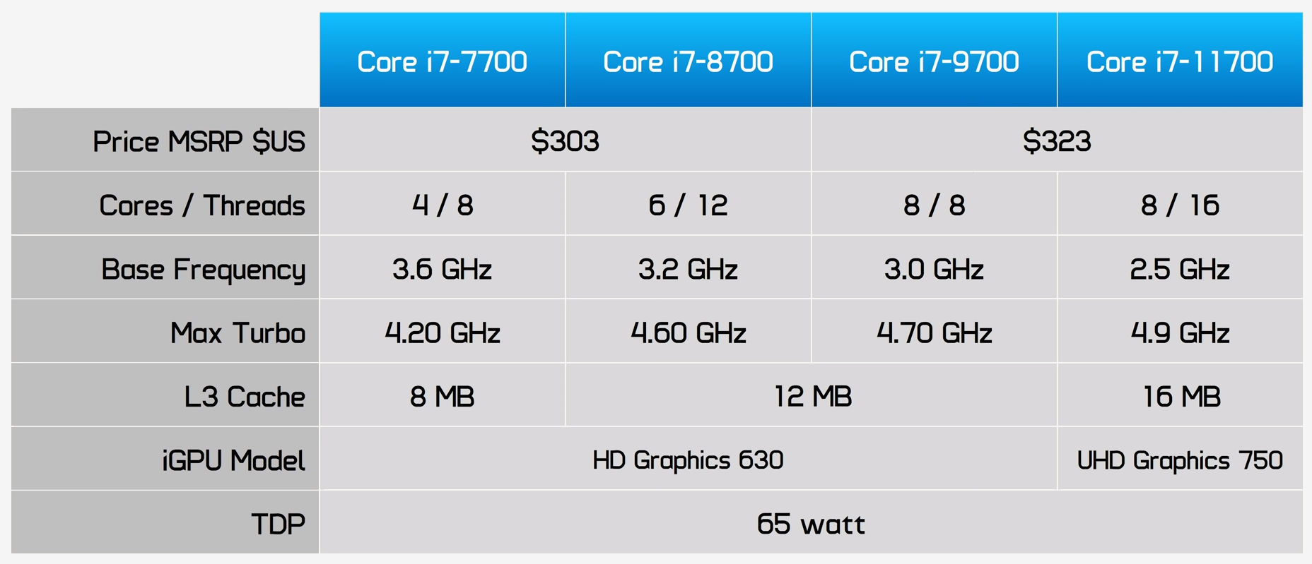 For example, the 65w Core i7-7700 saw just a 17% disparity between its base and boost clocks, then with the 65w Core i7-8700 that figure increased to 44%, and now we're at a ludicrous 96% with the Core i7-11700.