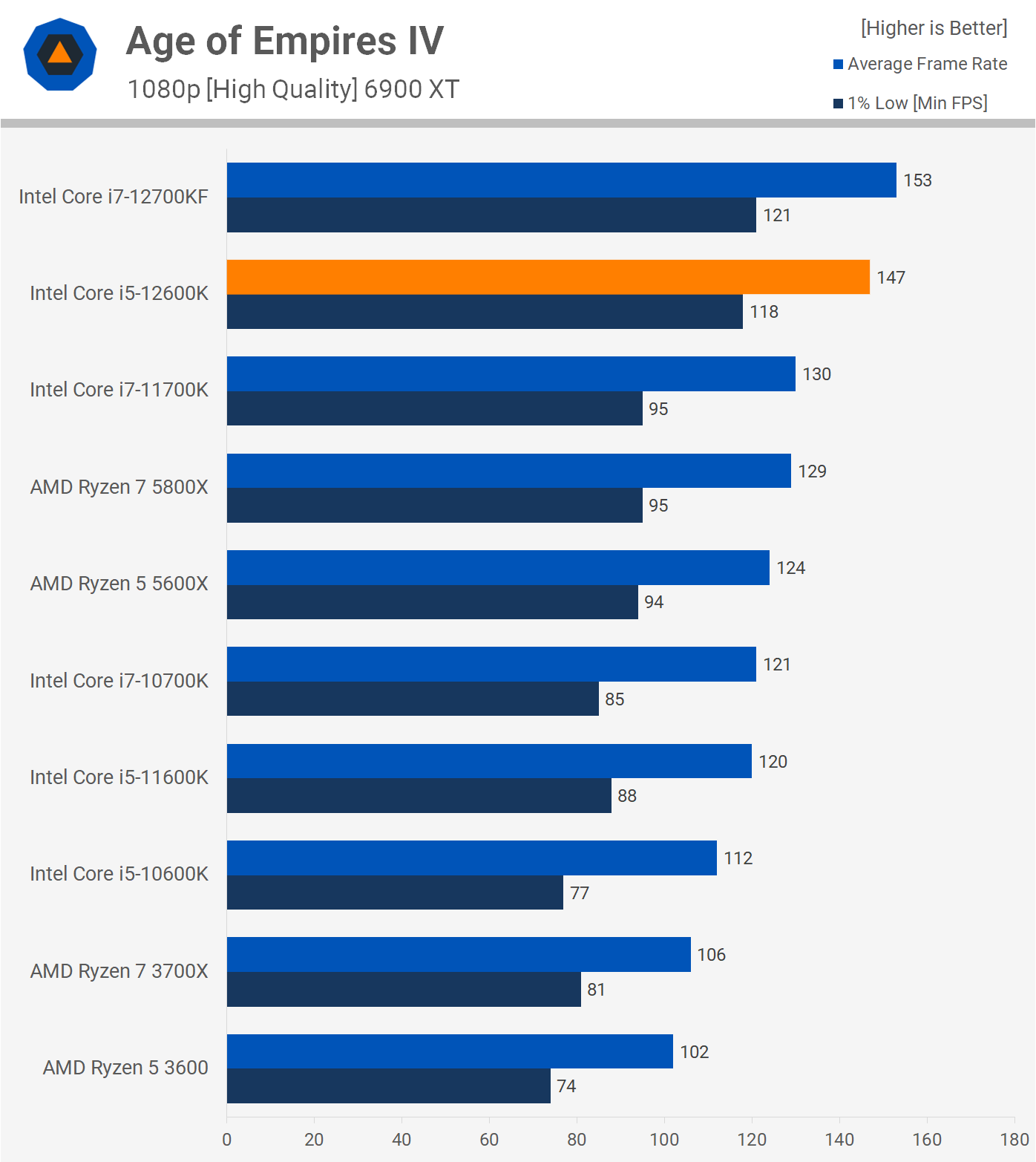 Where the Core i5-12600K really excels is on Age of Empires 4 where it's almost 20% faster than the 5600X, and that's a major performance advantage. It also meant that the new Core i5 part was a good bit faster than the 5800X and 11700K.