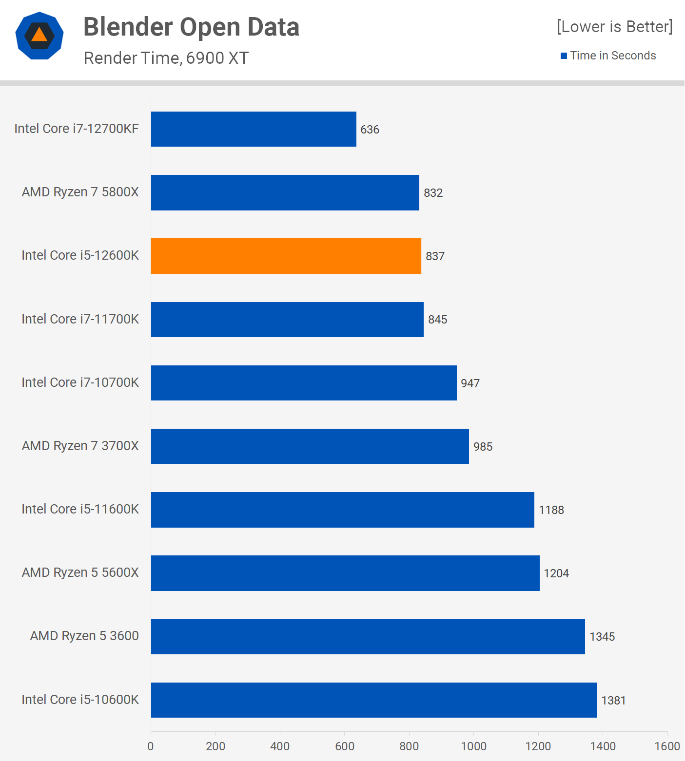 The last application benchmark that we're going to look at is Blender, and yet again the 12600K proves it's on a completely different level, smashing the 5600X by a massive 44% margin. Once again the new Core i5 processor is comparable to the 5800X and last generation's 11700K.