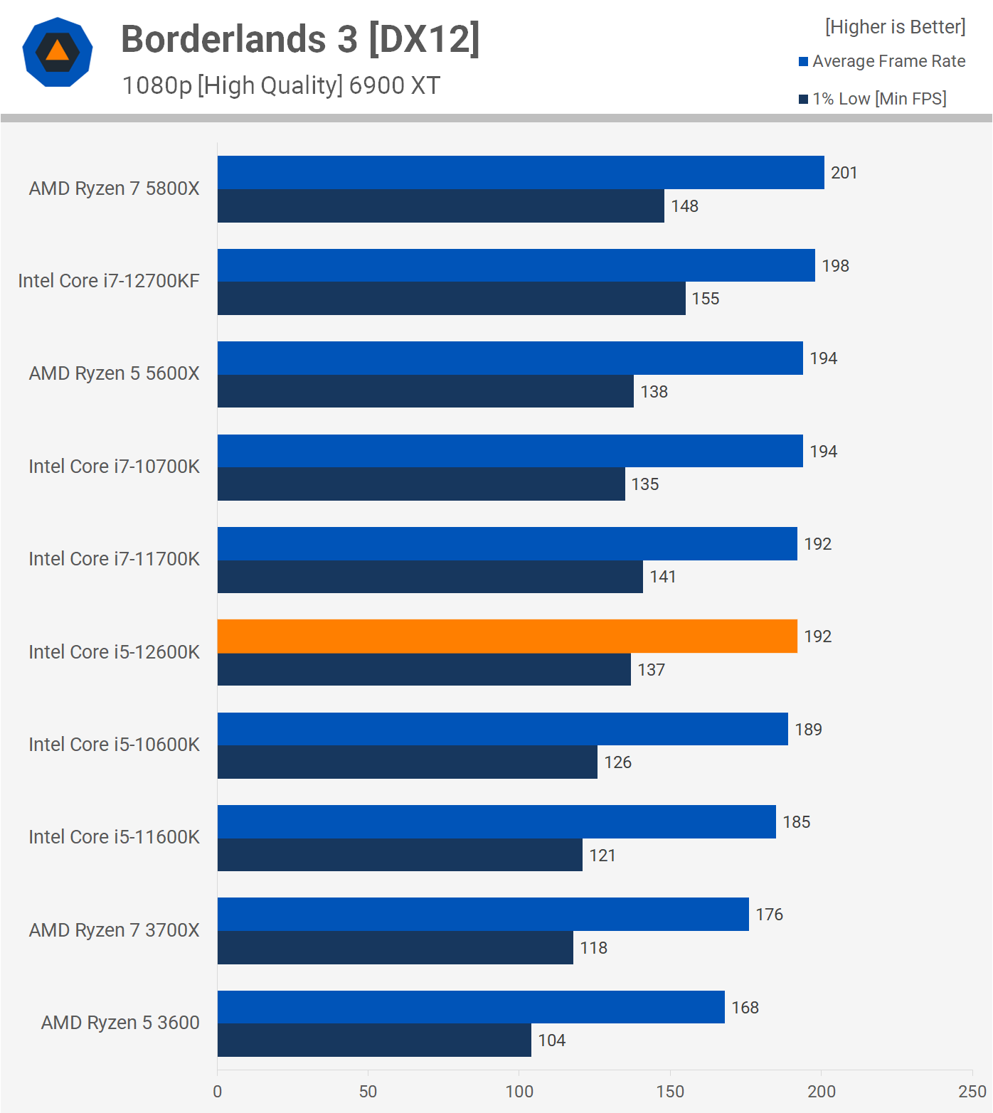 The 5600X and 12600K delivered basically identical performance in Borderlands 3 with no more than 2 fps separating them. Both were close to extracting the most amount of fps possible from the 6900 XT under these test conditions, so needless to say performance was excellent.