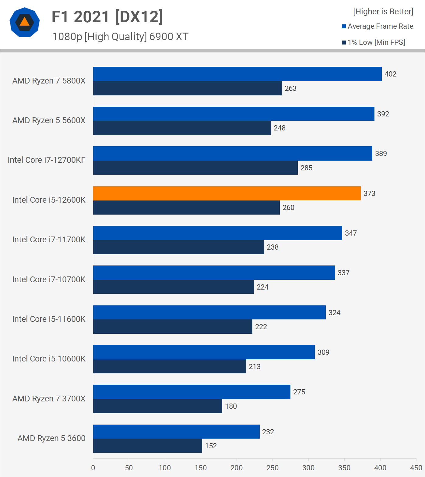 Time for the all-important gaming benchmarks and we'll start with F1 2021. For all gaming tests we're using the Radeon RX 6900 XT with dialed down quality settings at 1080p. The 12600K enabled 373 fps on average with a 1% low of 260 fps in this racing sim. When compared to the 5600X, we find the 12600K to be a mixed bag offering a 5% stronger 1% low, with 5% slower average frame rate performance. Overall though performance is much the same between these two processors, along with the 5800X and 12700KF.