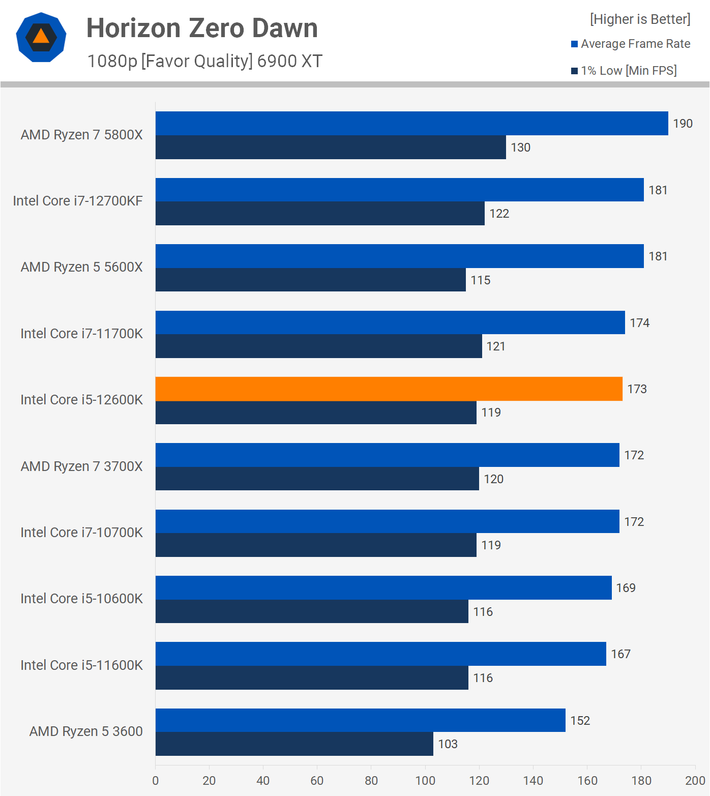 At least for now though, most games look like what we see here in Horizon Zero Dawn and that is to say, the gaming performance difference between the 12600K and 5600X is non-existent. The 5600X was 5% faster when comparing the average frame rate, but 3% slower for the 1% low, so again performance here is indistinguishable.