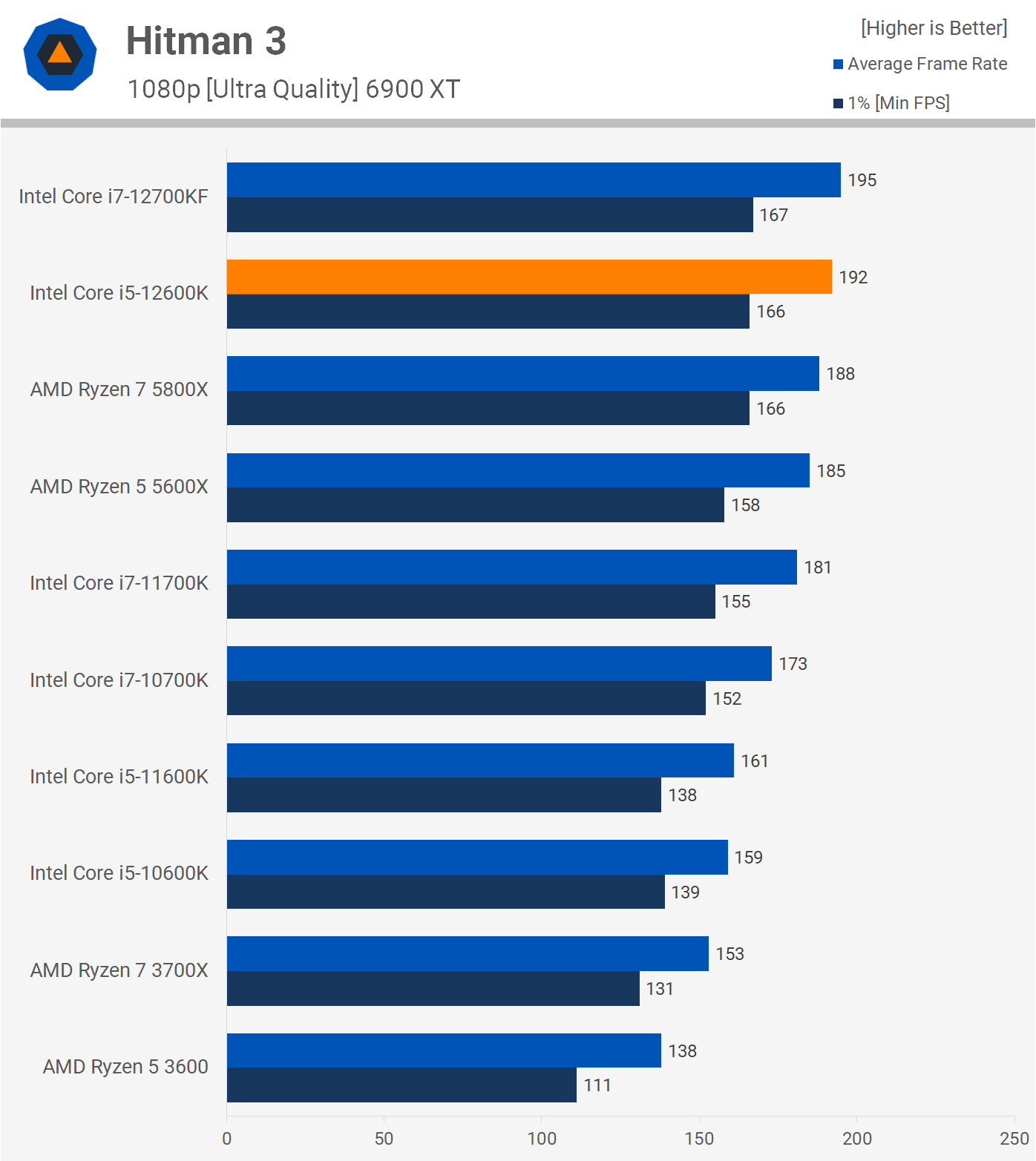 Hitman 3 is also very CPU demanding, but again, if you have a 6-core/12-thread processor from the past few generations you've got more than enough processing power to avoid any frame stuttering with well over 100 fps for the 1% low. That being the case, the 12600K crashed it with 166 fps for the 1% low and 192 fps on average making it 4% faster than the 5600X.