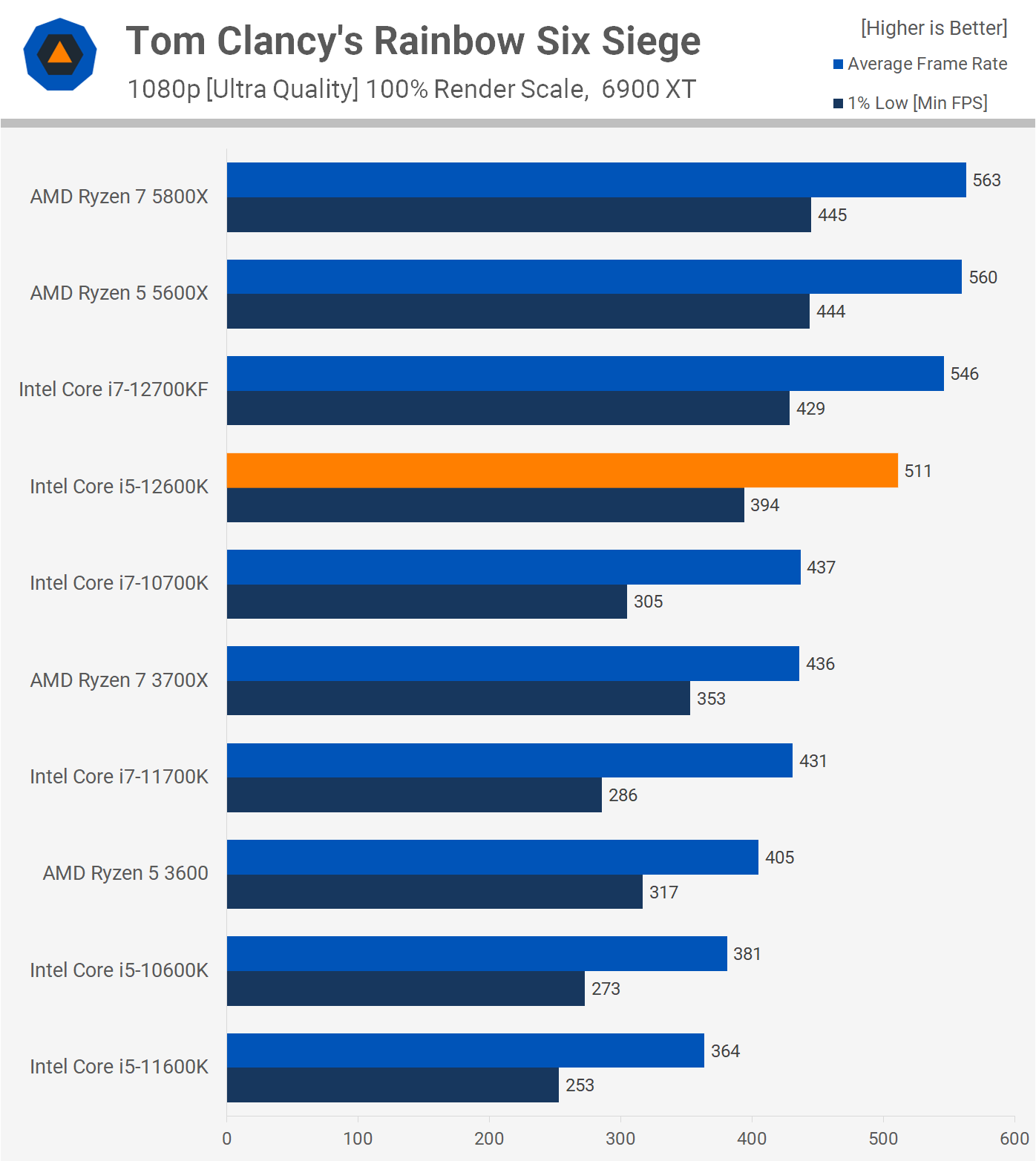 Moving on to Rainbow Six Siege, the 12600K is less impressive despite pushing up near 400 fps at all times with an average frame rate of 511 fps. The 5600X is 10% faster, though how much that even matters is hard to say given all CPUs tested here were capable of pushing extreme frame rates.