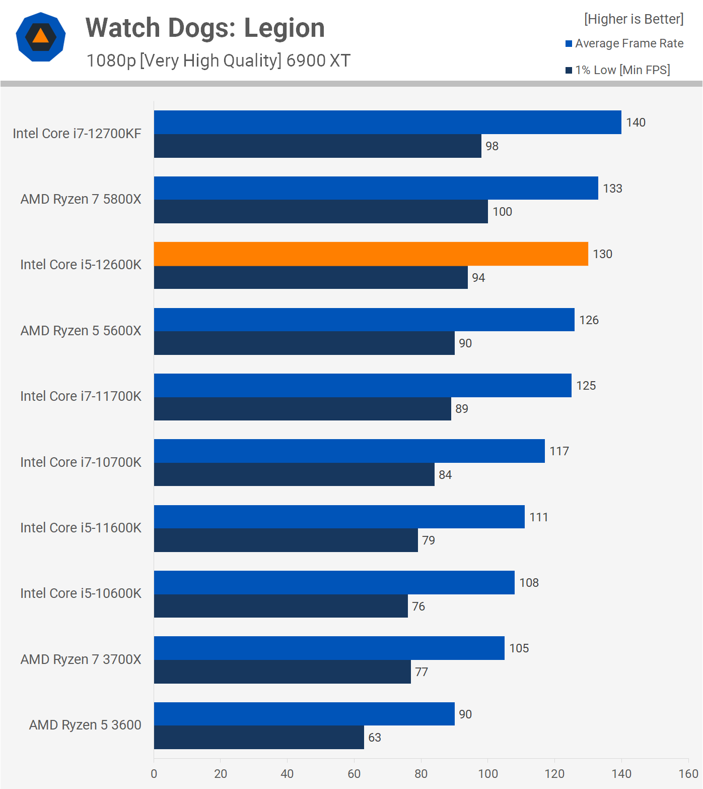 Moving on to Watch Dogs: Legion, we again find that the 5600X and 12600K are evenly matched when gaming, this time the Intel processor was faster by a small 3% margin.