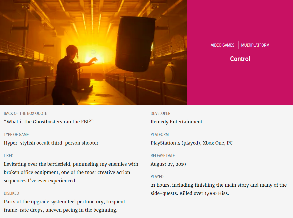 Control is the latest game from the makers of Max Payne, Alan Wake, and Quantum Break. It's a twisted, haunting odyssey through an old post-WWII office building under siege by parasitic beings from another dimension. Control has all the standard elements of a regular third-person shooter, but its exhaustive world building and all-consuming eeriness make it much more.