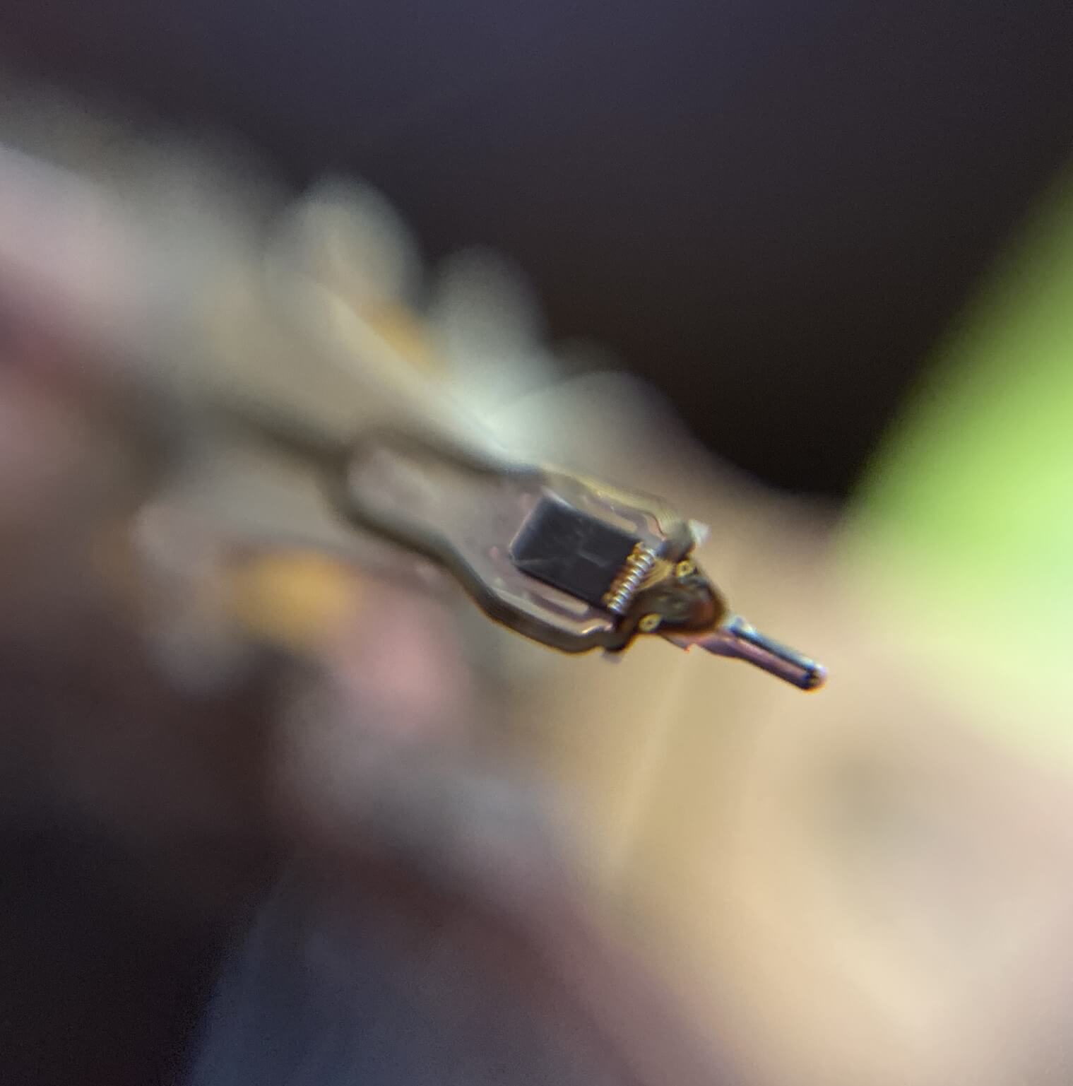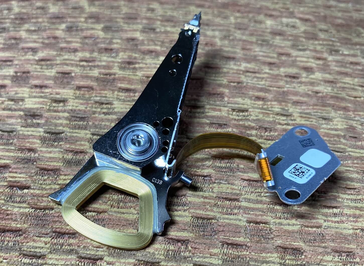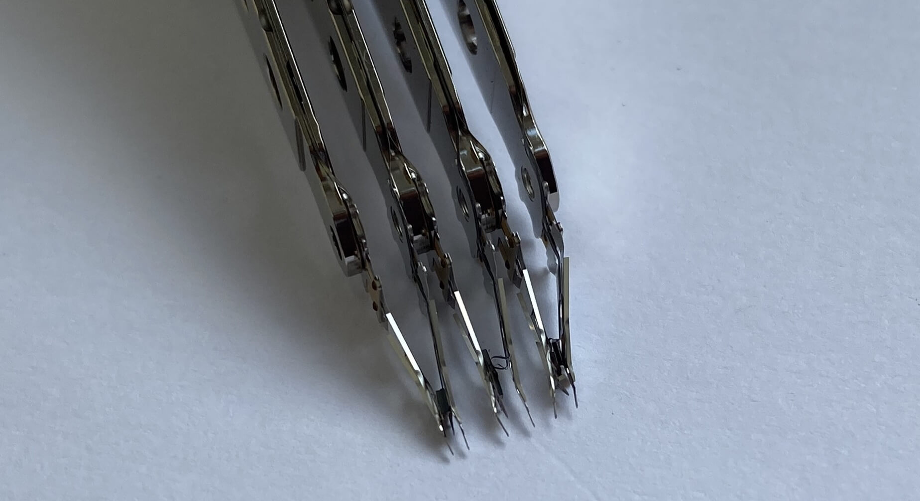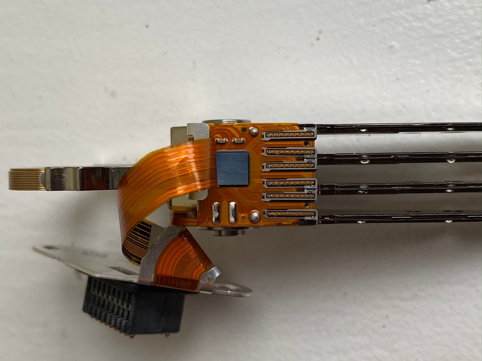 At the very ends of the arms are the delicate read/write heads. Our HDD has 3 platters and 6 heads, and each one floats above the disk as it spins. To be able to do this, the heads are suspended by two ultra thin strips of metal.