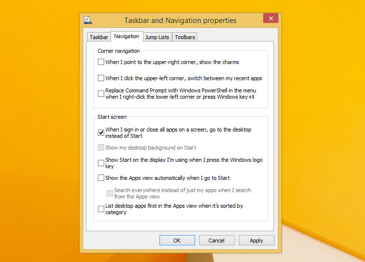 Thank you, Microsoft. You now get the option to boot directly to the desktop, even if it's not a prominent setting, it's accesible from the taskbar properties. Hot corners can be disabled which makes sense if you are a desktop power user with multiple monitors. The change helps you forget about Metro if you don't want to see it. But...