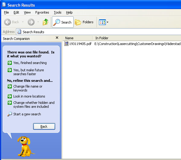 Enter Windows XP and search has been "improved." You now need to click on several buttons to select how to search, which is slower and more cumbersome. Oh, and you get to watch a dog go "fetch." On the upside, XP's search engine resembles that of 2k's, it's just adorned the same way the OS was, blue ribbons and all.