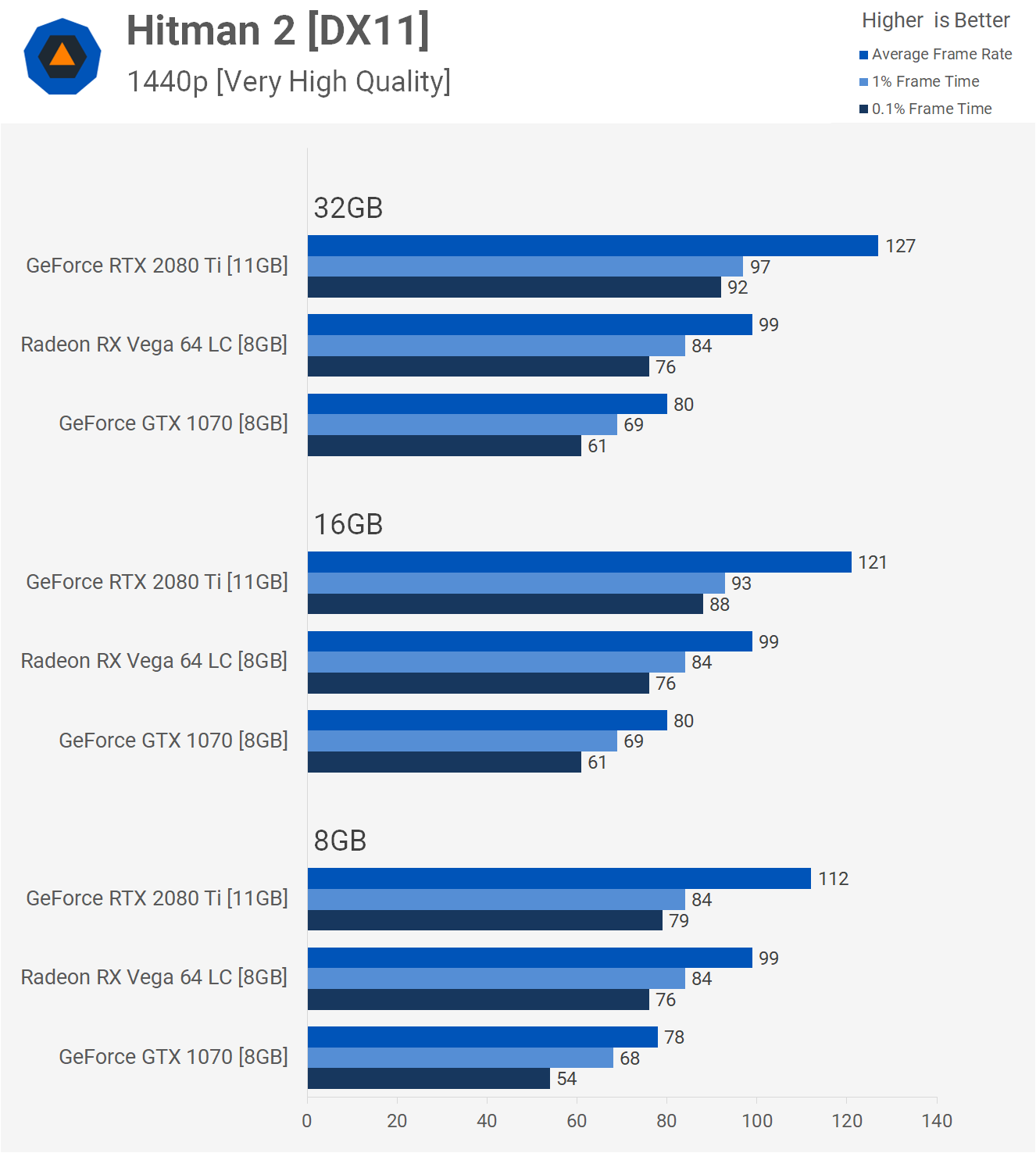 The Hitman 2 results are interesting for a few reasons. The RTX 2080 Ti consistently saw a performance reduction as we lowered the amount of available system memory, and it wasn't just frame time performance that suffered. We saw previously that this game was memory hungry, but 16GB of RAM should more than cover it, so it's interesting to see the 32GB configuration offering 4-5% more performance.