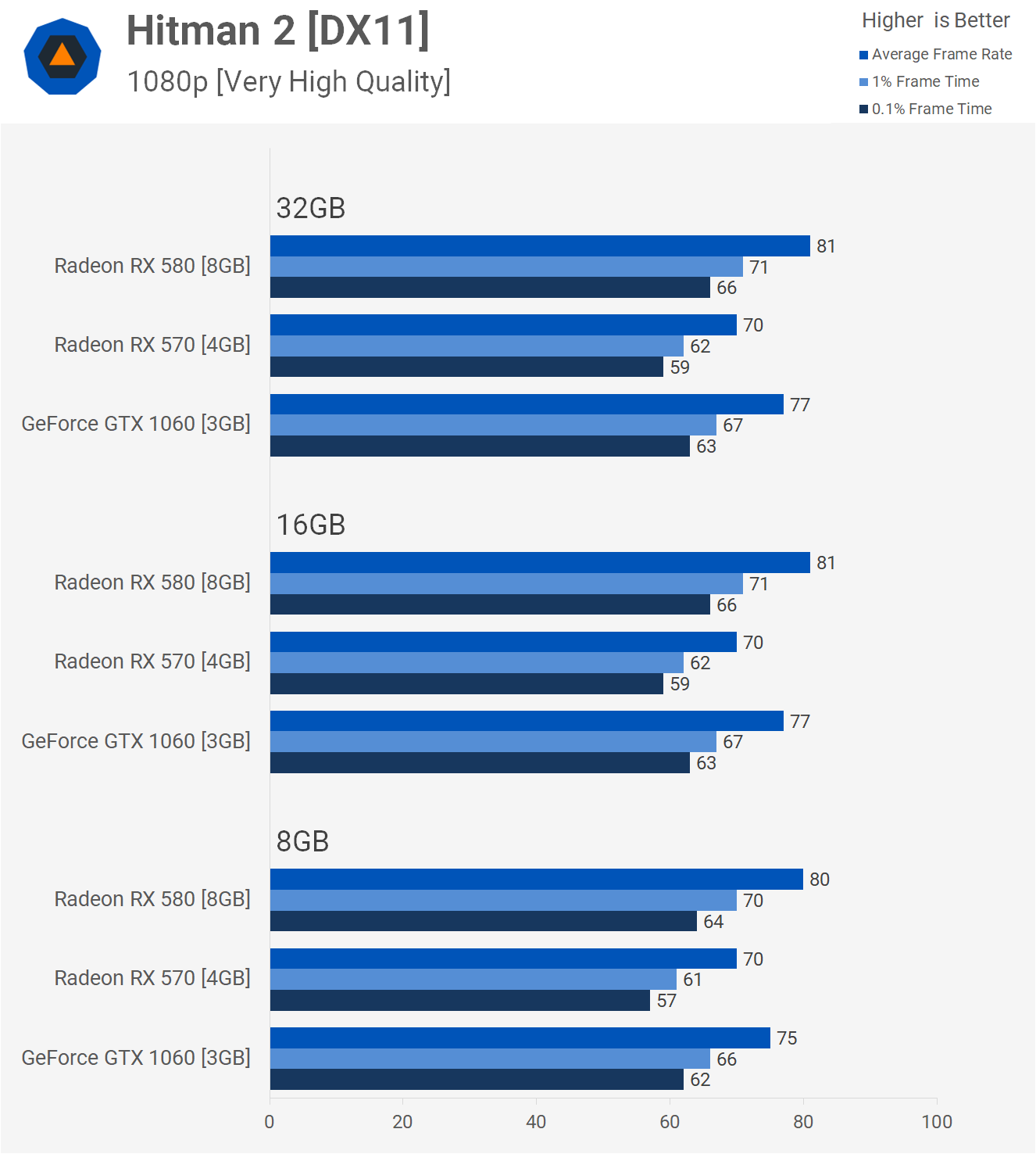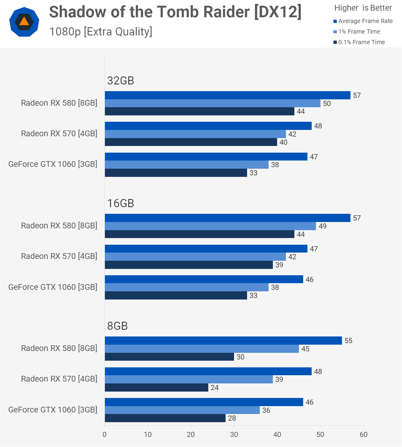 Previously we found that lower-end graphics cards featuring less VRAM tend to suffer the most when running with limited system memory. So I went back and re-tested with the Radeon RX 580 8GB, RX 570 4GB and GTX 1060 3GB at 1080p and 1440p.