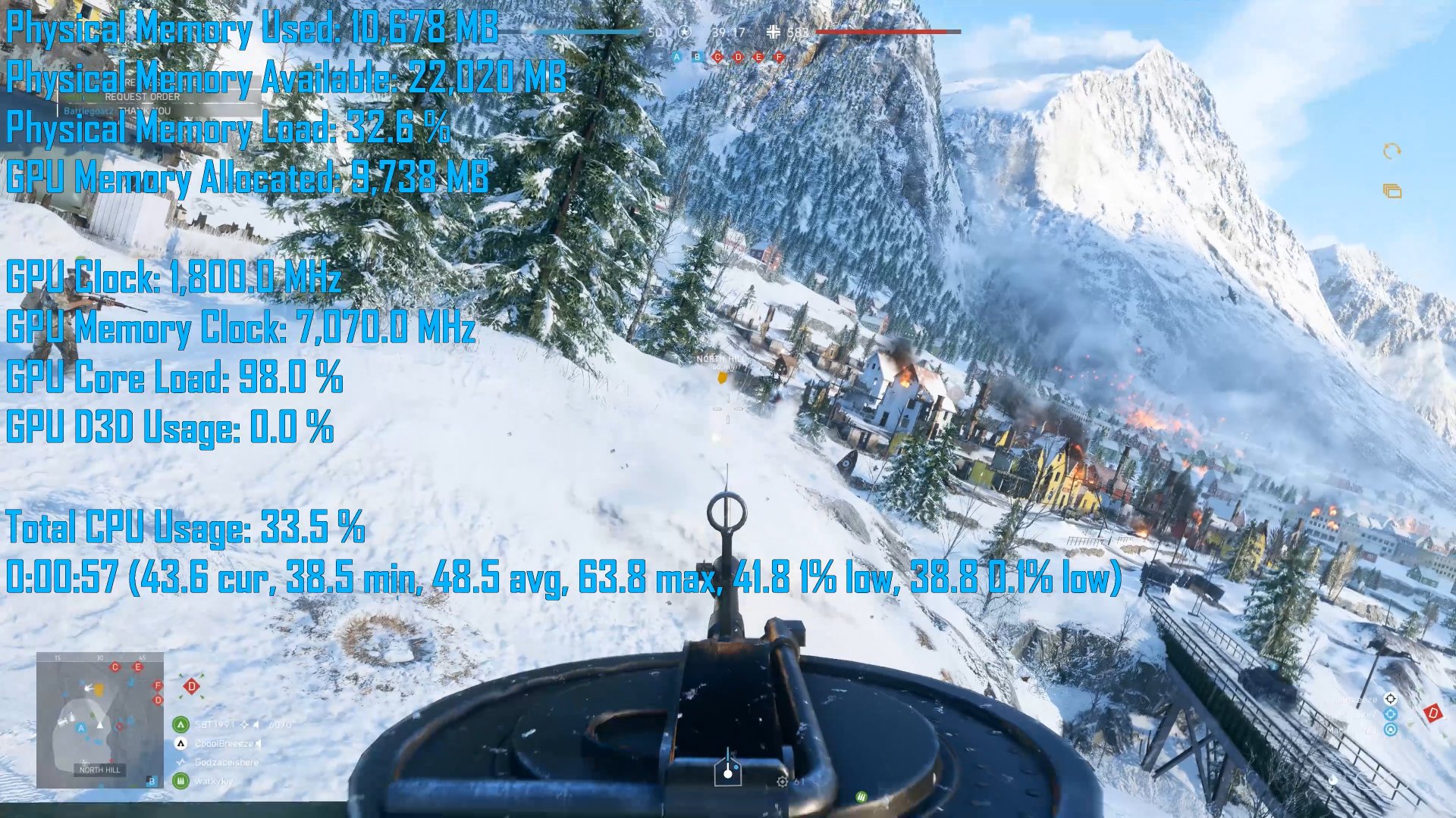 Next we tested Battlefield V multiplayer using the 64-player mode. Here RAM usage got up to around 33% hitting 10.8GB and basically never dropped below 10.4GB. VRAM allocation was also very high, holding steady at 9.7GB on the Narvik map. So we have another title that will likely run into stuttering issues with 8GB of memory.