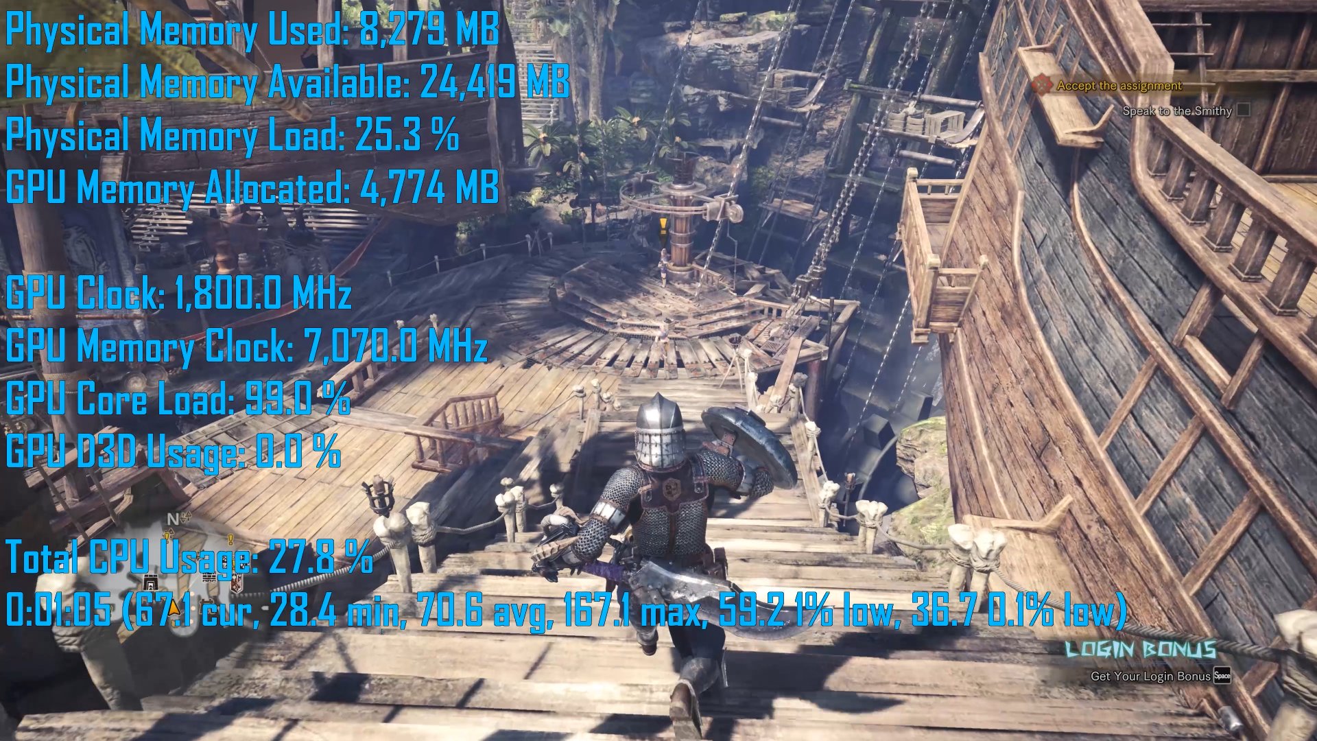 Monster Hunter World is a title that should work just fine with 8GB of RAM, here we saw allocation peak at 8.3 GB. VRAM usage was also low at under 5GB.