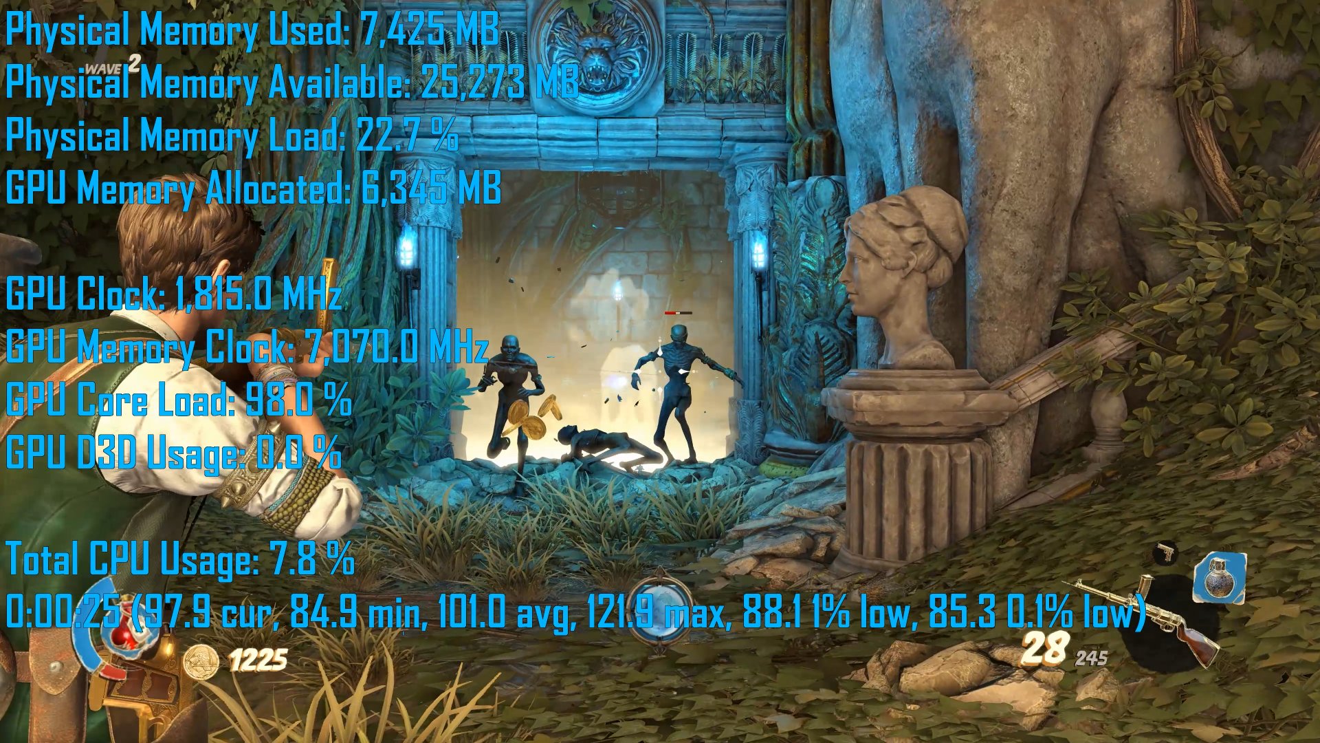Strange Brigade is a well optimised title that runs very well on a wide range of hardware. Therefore it wasn't surprising to find that the memory requirements aren't high. 7.5GB of RAM was allocated though at the 4K resolution VRAM usage did hit 6.5GB, certainly nothing extreme there.