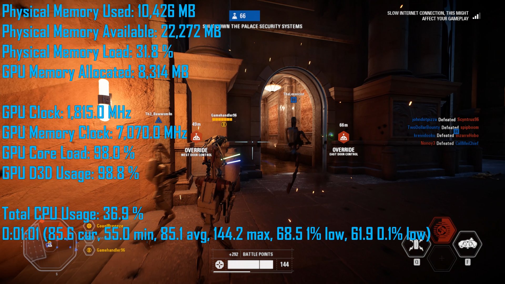 Star Wars Battlefront II is a memory intensive title as we saw RAM allocation pushed to ~10.5GB. VRAM usage was also quite high at around 8.3GB.