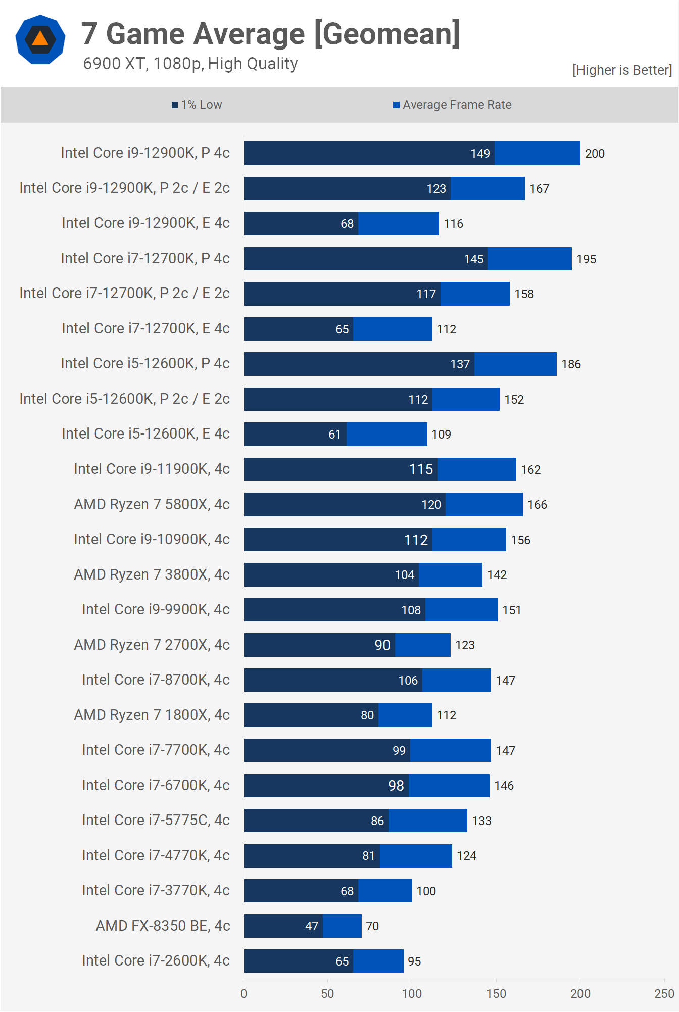 That was eye opening to say the least. Those E-cores don't do well at gaming and there's a good reason why, which we'll get to in a moment. For now let's take a look at the 7 game average we collected.