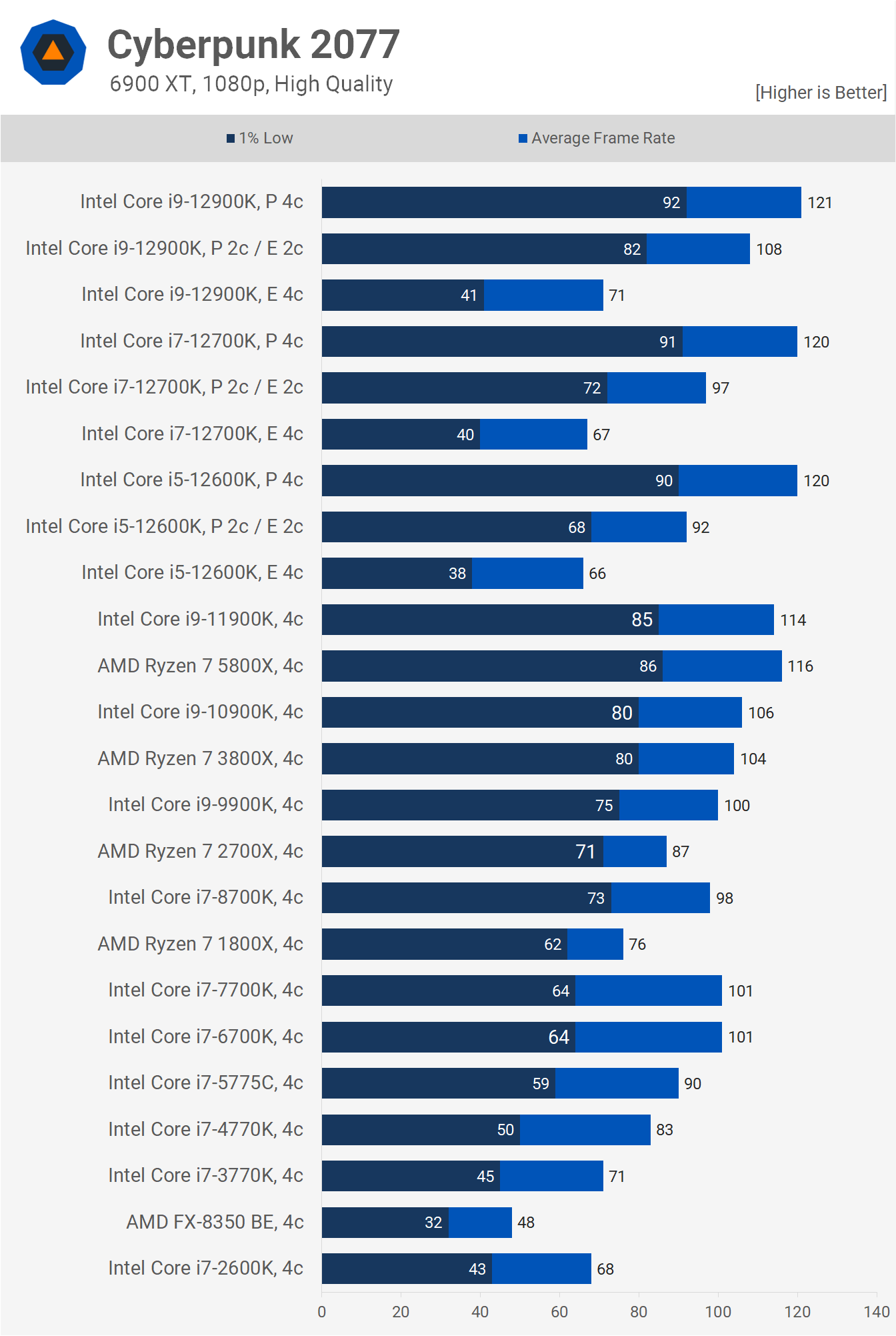 So again, if we compare the E-core only configurations to older CPU architectures, we see that performance is nowhere near Skylake. The 1% low performance was as bad as what we saw with AMD's Bulldozer, while the average frame rate was much closer to Ivy Bridge than it was to Skylake.