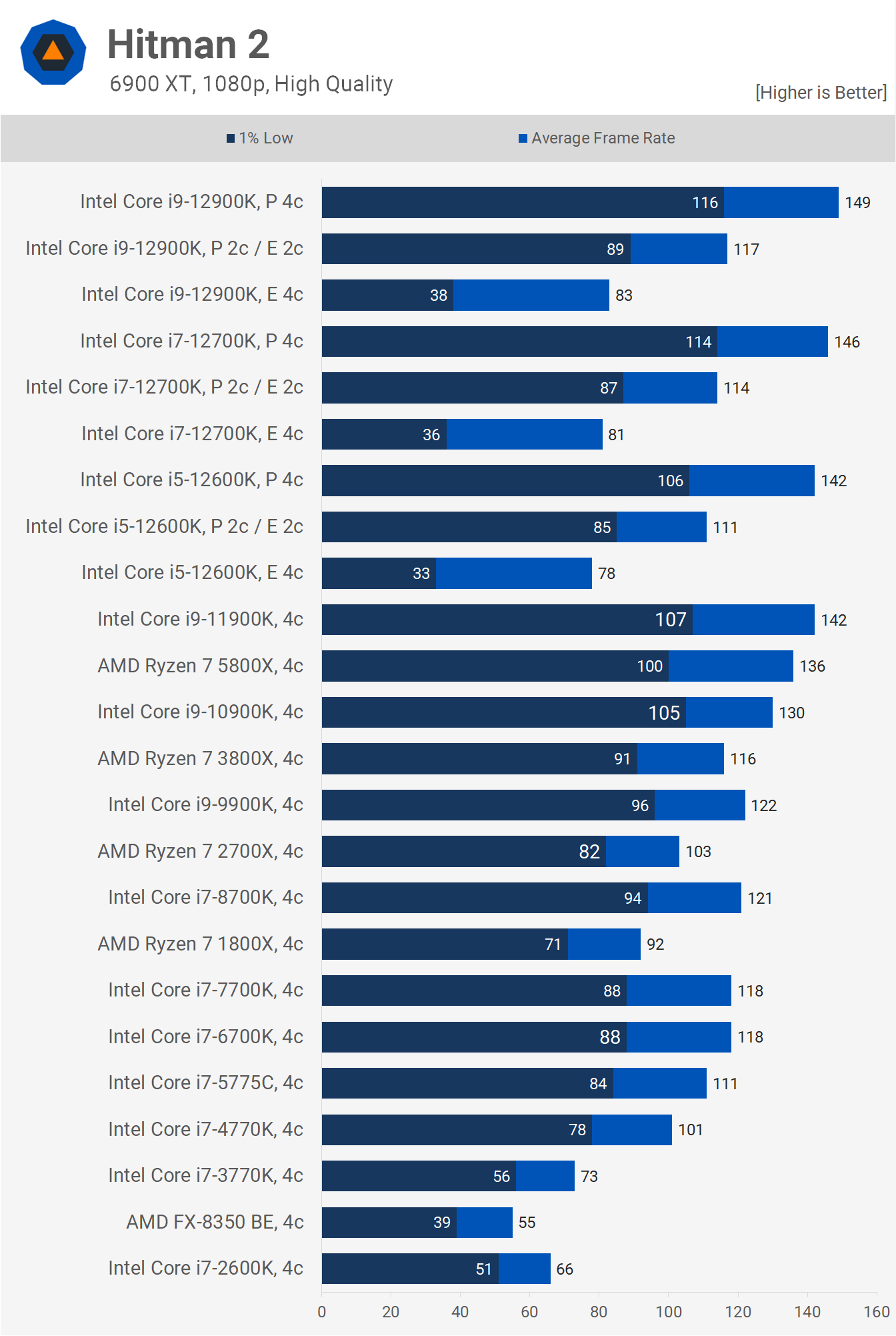 The NPC heavy Hitman 2 test crushes the E-cores. This is similar to what was seen when testing with Battlefield V. Performance across all three 12th-gen parts is similar and that means we're looking at a 41% performance improvement with 2 P-cores and 2 E-cores compared to just using the E-cores. Actually, if we look at the 1% low performance, it's closer to a 134% jump, which is crazy.