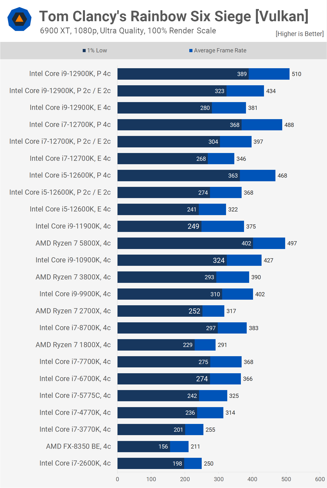 Starting with Rainbow Six Siege, there's quite a bit to go over, so bear with me. First let's just look at the Core i9-12900K, we see with four P-cores enabled and locked at 4.2 GHz that this configuration was good for 510 fps, just 3% faster than AMD's Zen 3 architecture.