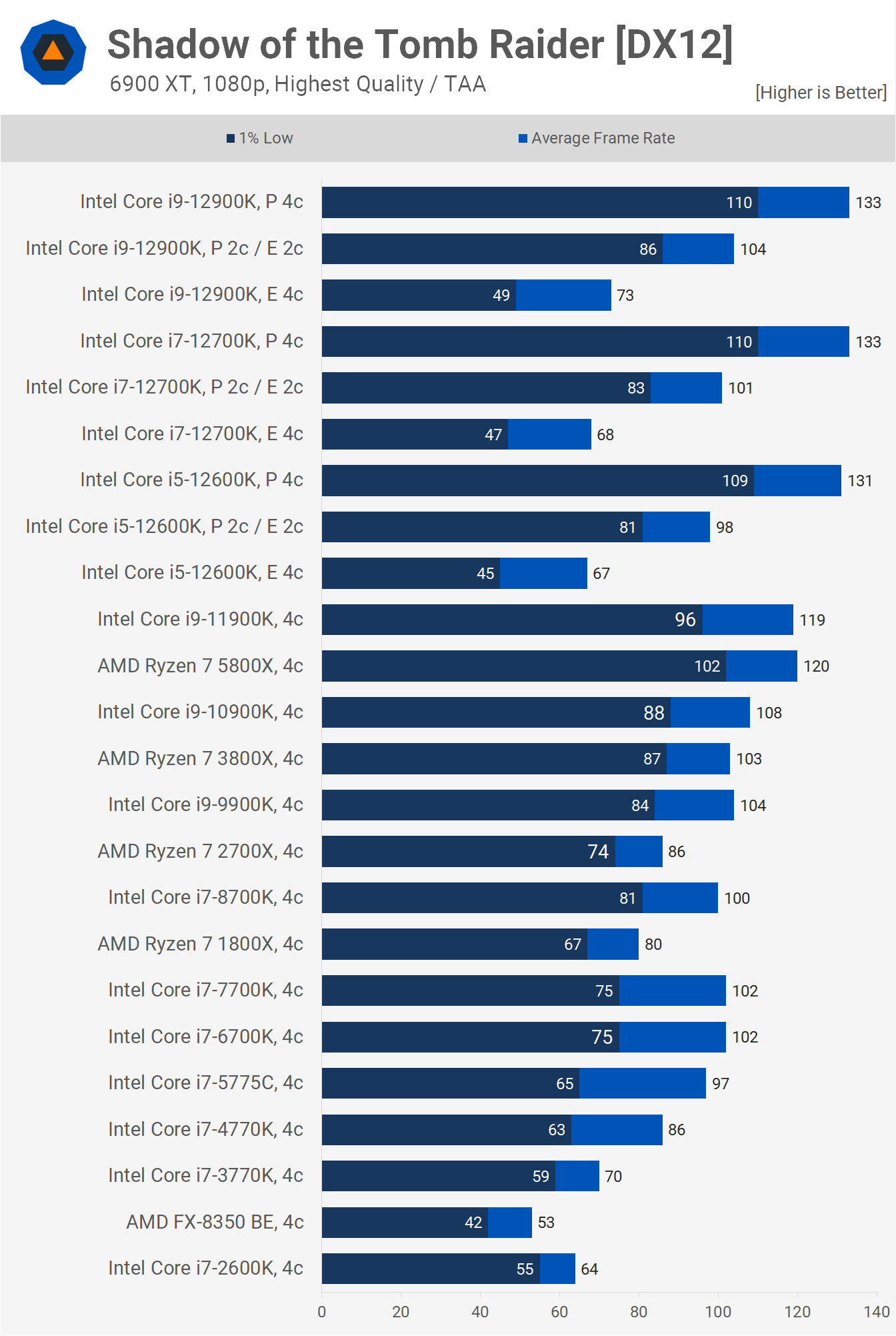 Finally, we have Shadow of the Tomb Raider and here we see very little difference between the various Alder Lake CPUs, so the cache capacity has almost no tangible influence here, at least for these core configurations. We had found previously with the 10th-gen series that the larger L3 cache is of greater utility when more cores are available.
