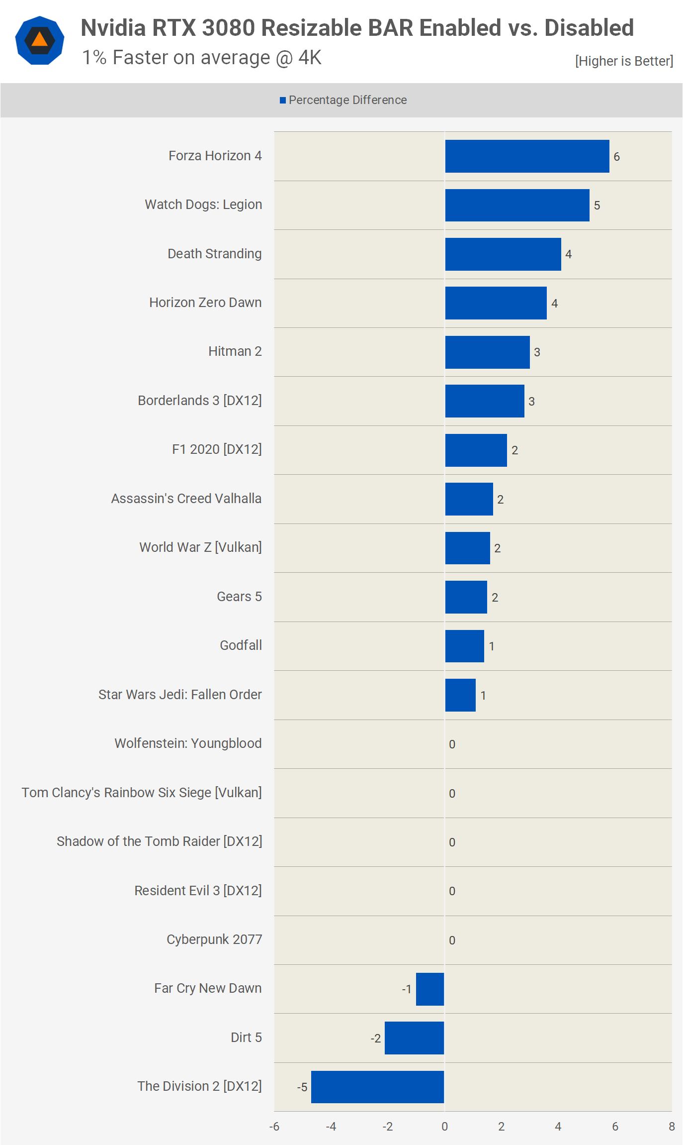 Resizable BAR is a little more effective at 4K. The 1-2% drops seen in Far Cry New Dawn and Dirt 5 are insignificant, while a few others stand to benefit, if only slightly.