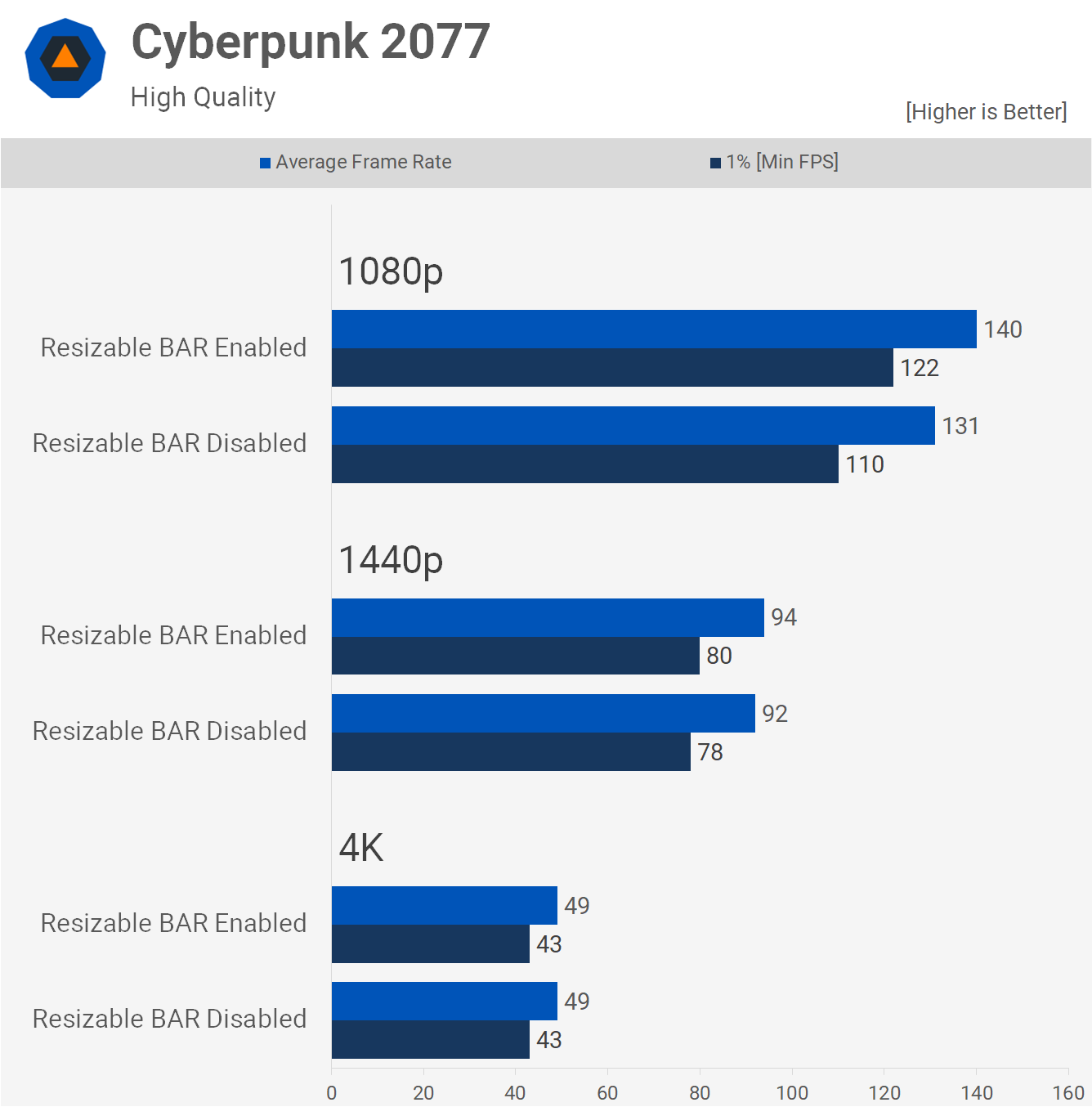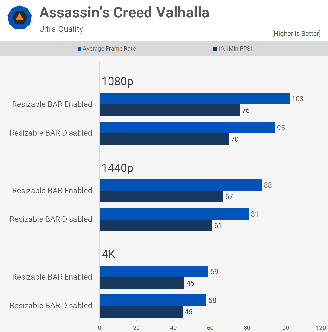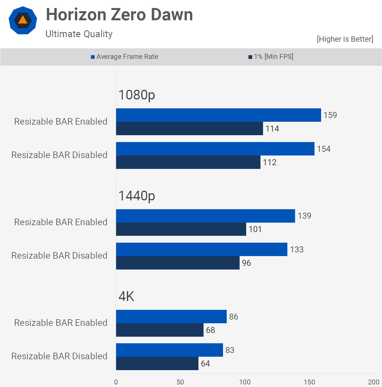 We're looking at a mild performance uplift in Horizon Zero Dawn with resizable BAR enabled, just 3% at 1080p, 5% at 1440p and 4% at 4K. Not exactly something to get excited about, but again it's a small performance boost for free, so who's going to complain about that?