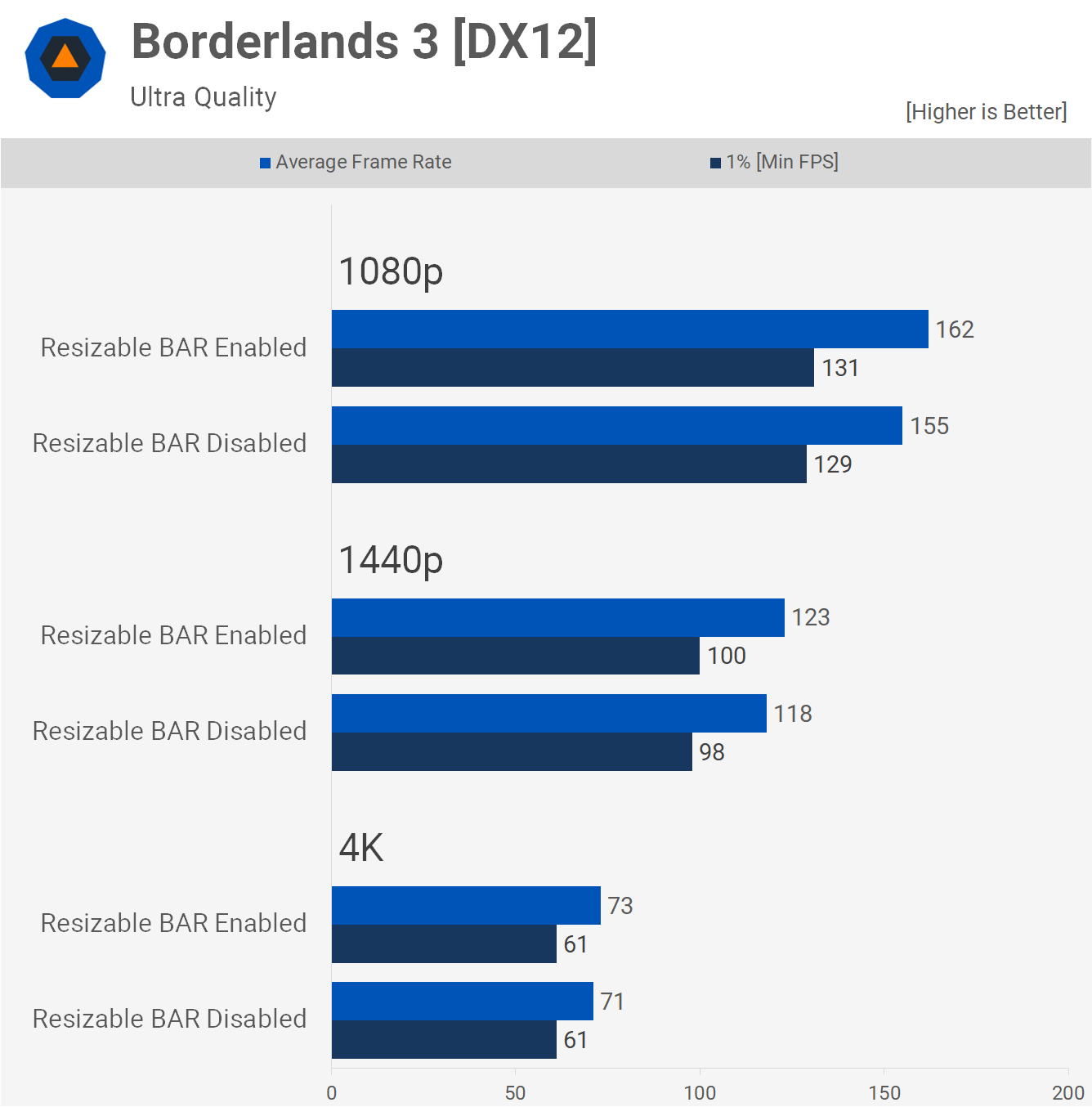 The gains in Borderlands 3 are also small: a 5% boost at 1080p, 4% at 1440p, and just 3% at 4K.