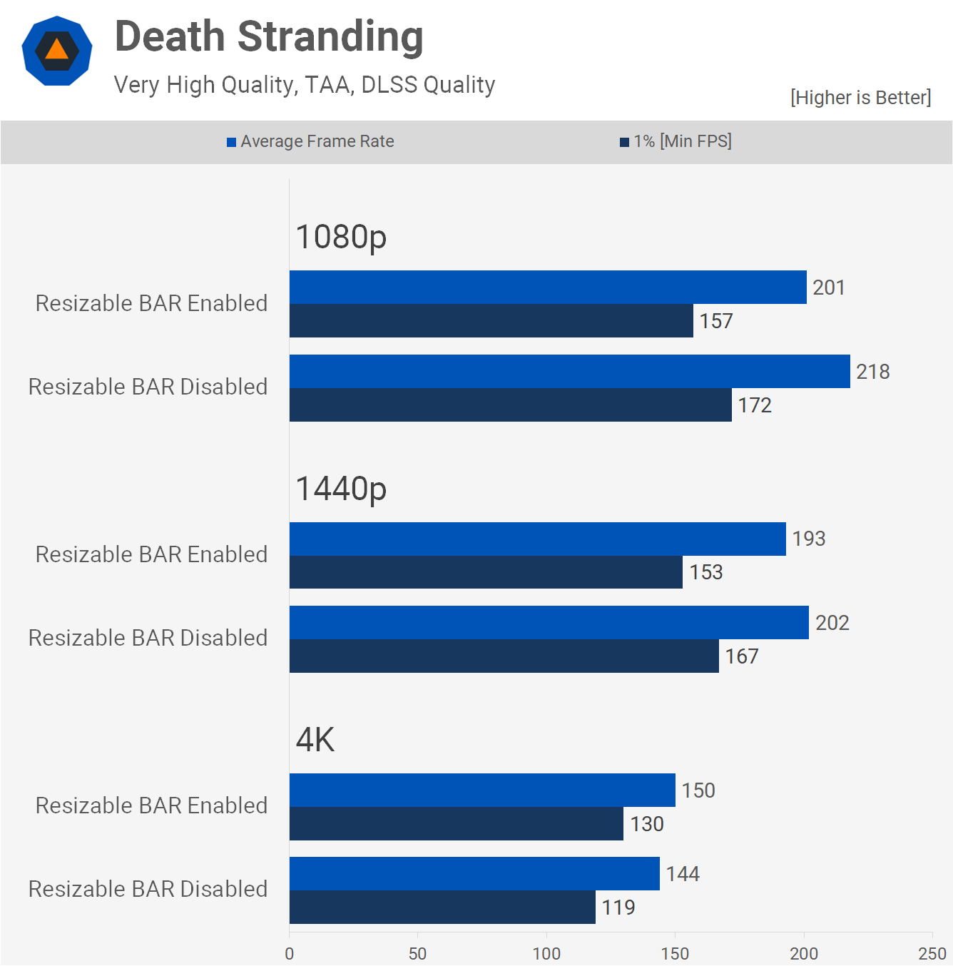 The odd results didn't stop there. Death Stranding also saw a reduction in performance at 1080p and 1440p with resizable BAR enabled despite being a whitelisted title. We did see up to a 9% increase at 4K which was great to see, but the implementation here is hardly flawless with up to a 9% reduction seen at 1080p and 8% at 1440p.