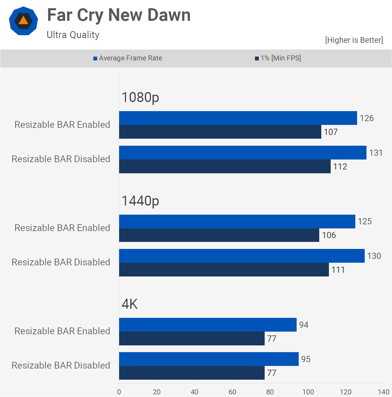 Far Cry New Dawn also isn't a whitelisted game, but here we are seeing a performance regression with resizable BAR enabled at 1080p and 1440p, so what's going on here?