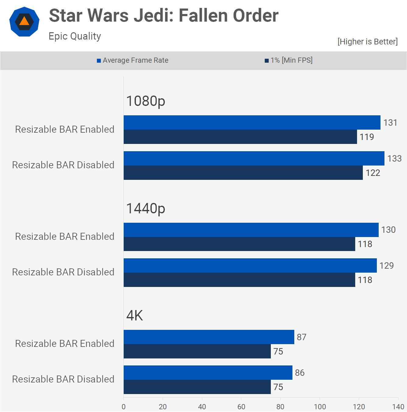 There were a number of titles like Star Wars Jedi: Fallen Order where performance went virtually unchanged. If we're to believe Nvidia's claims, we could be looking at a situation where resizable BAR has been disabled to avoid a performance regression as this isn't a whitelisted game, but more on that soon.