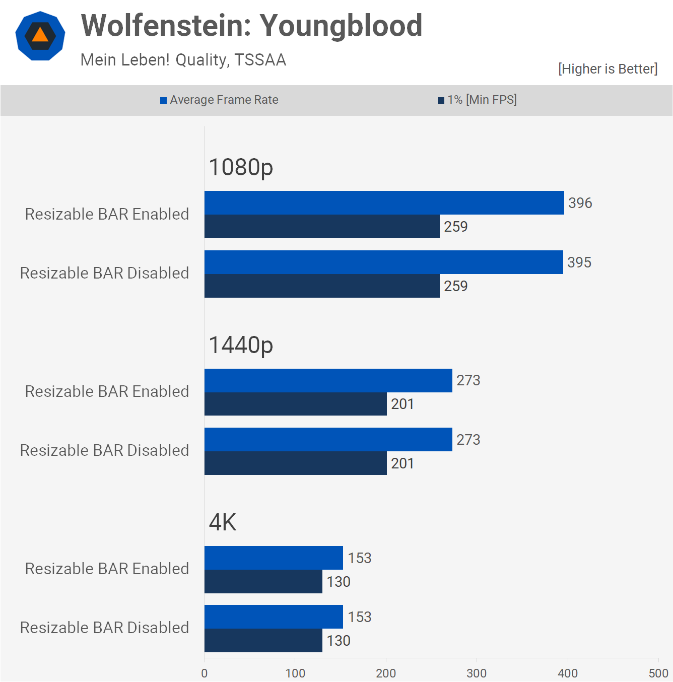 Wolfenstein Youngblood also isn't a whitelisted game, and here we're seeing no change in performance with virtually identical frame rates with and without resizable BAR.